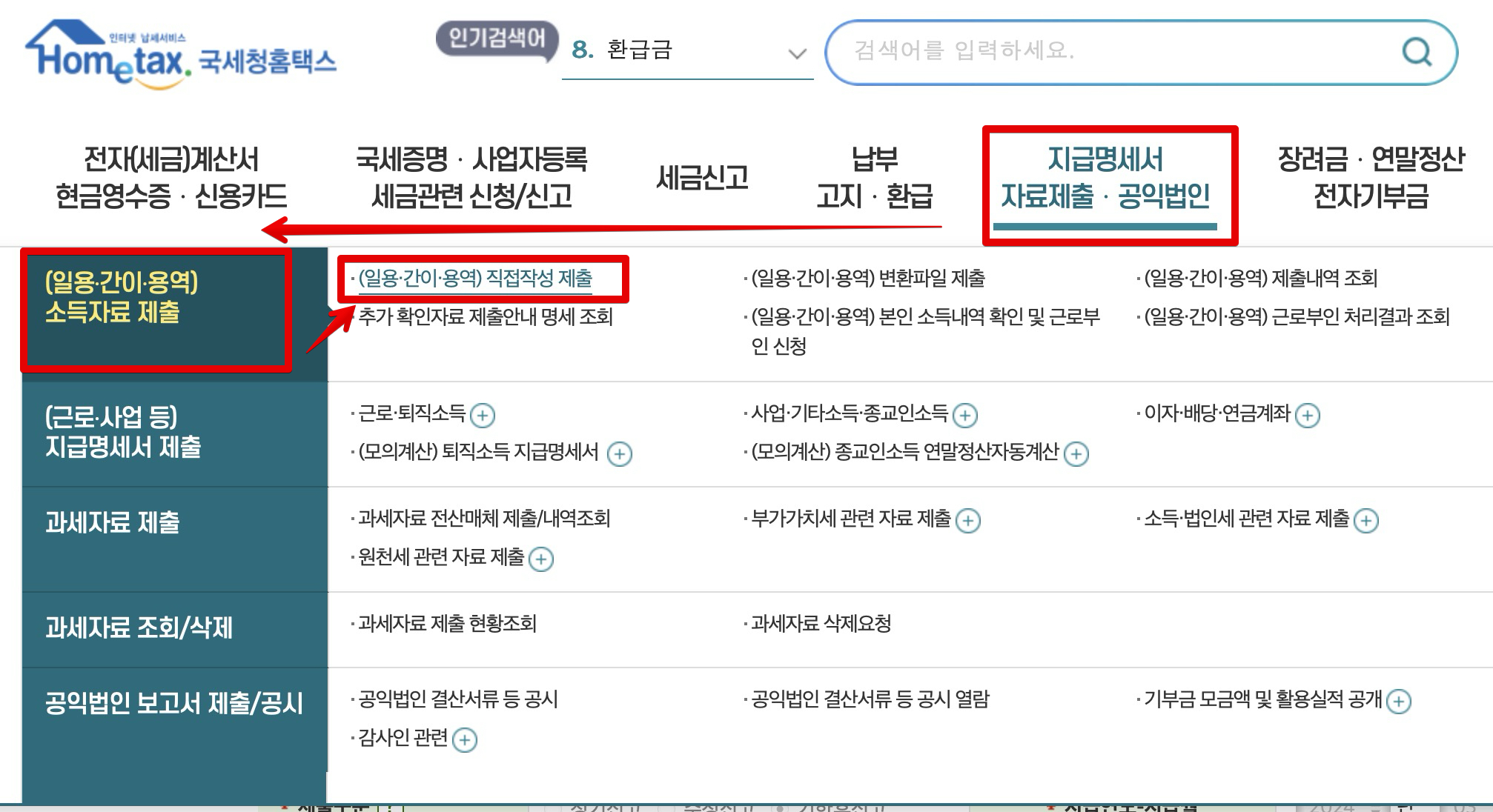 일단 제일 먼저 국세청 홈택스에 로그인 한 후 [지급명세서 자료제출 공익법인] 메뉴에서 [(일용 간이 용역) 소득자료 제출]로 들어간 다음 [(일용 간이 용역) 직접 작성 제출]로 들어갑니다.