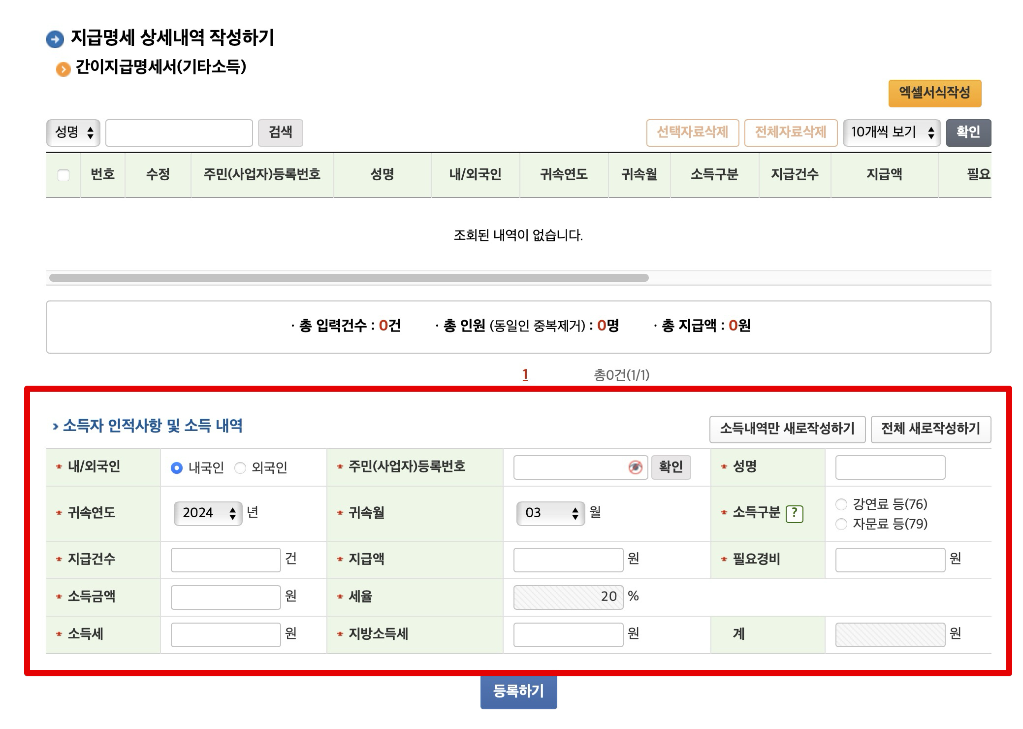 다음으로 지급명세 상세내역 작성하여 제출합니다. 이 부분은 기타소득 신고할 때와 비슷한 화면으로 개인에게 지급된 경우 주민번호를 입력하여야하므로 해당 인원의 신분증 사본 등이 필요하며 이름도 필요합니다.
