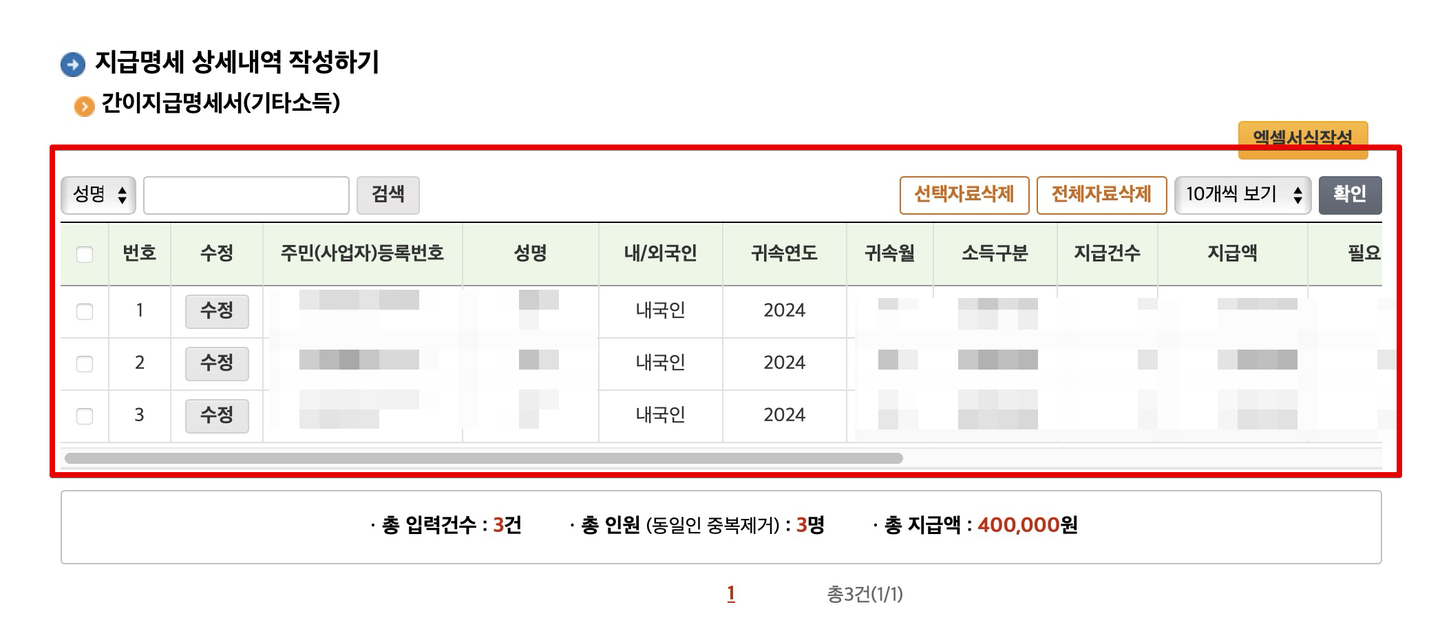 모두 입력을 마치면 이런식으로 지급명세 상세내역 작성하기 메뉴에서 전체를 확인할 수 있습니다.