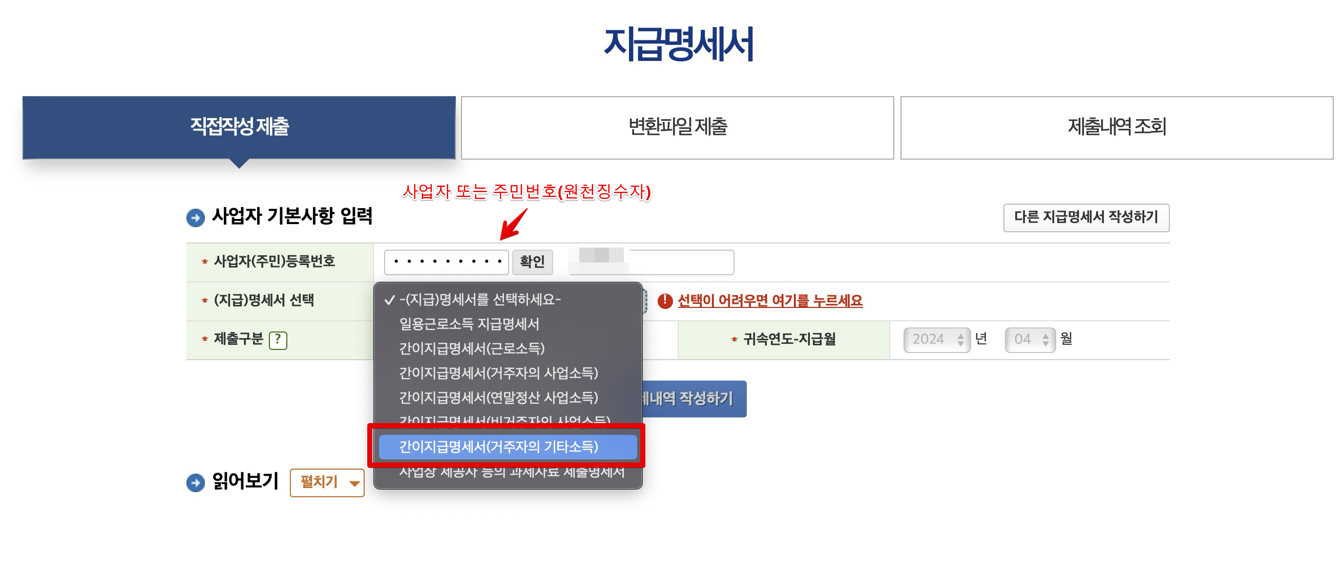 다음으로 화면을 내리면 [지급명세서] 부분이 나타나는데 여기에서 상단 메뉴에 [직접작성 제출]이 선택되어 있는지 체크하시고요. 다음으로 주민번호 또는 사업자번호를 입력한 후 확인을 누릅니다. 이후 [(지급)명세서 선택]에서 간이지급명세서(거주자의 기타소득)으로 설정합니다. 그리고 지급명세서를 작성하려면 먼저 국세청 홈택스 시스템에서 원천세 신고가 이루어져야합니다. 따라서 위에 링크한 이전 포스팅을 참고하여 원천세 신고를 진행한 후 지급명세서를 제출하는게 편리합니다.
