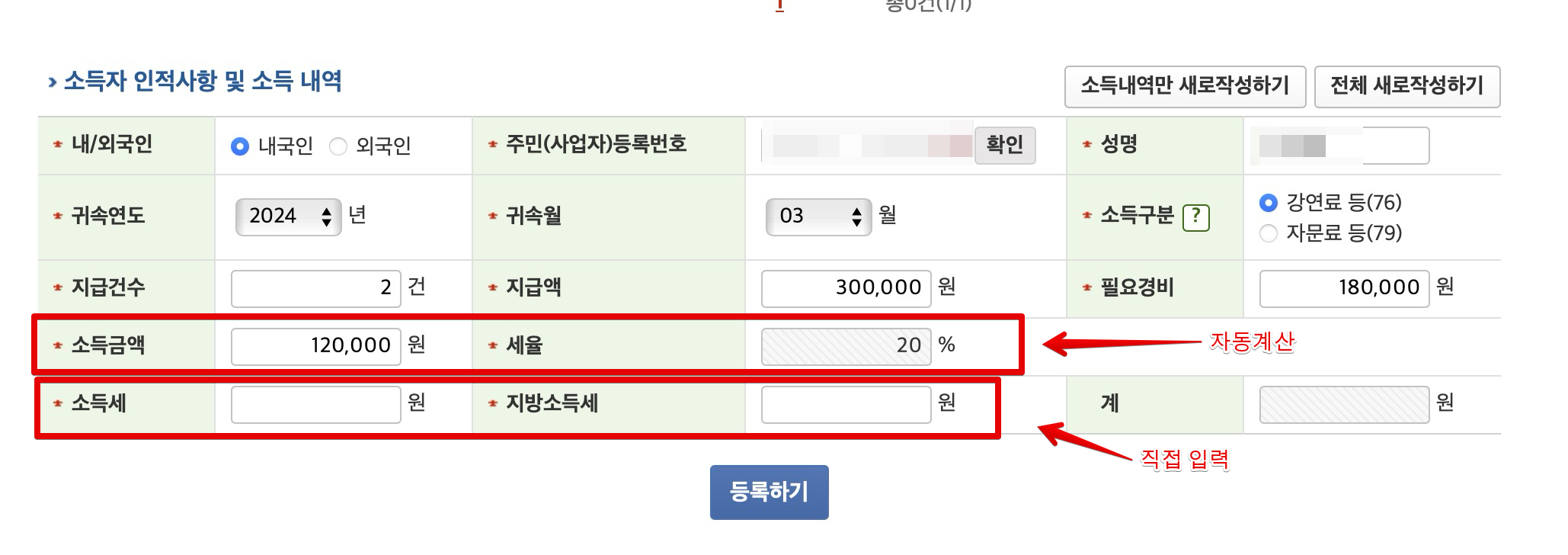 이제 다음 화면으로 넘어가서 지급액을 입력합니다. 그러면 자동으로 필요경비와 소득금액이 잡히며 세율은 기본적으로 고정돼 있습니다. 그런데 한가지 아쉬운 부분은 소득금액과 세율이 나오면 사실은 소득세와 지방소득세도 자동으로 계산이 되도록 만들 수 있는데도 불구하고 현재 시스템에서는 소득세와 지방소득세는 직접 입력을 해주어야하는 불편이 있습니다. 전체금액의 8.8%를 원천징수 하였기 때문에 8%는 소득세로, 0.8%는 지방소득세로 입력하면 됩니다.