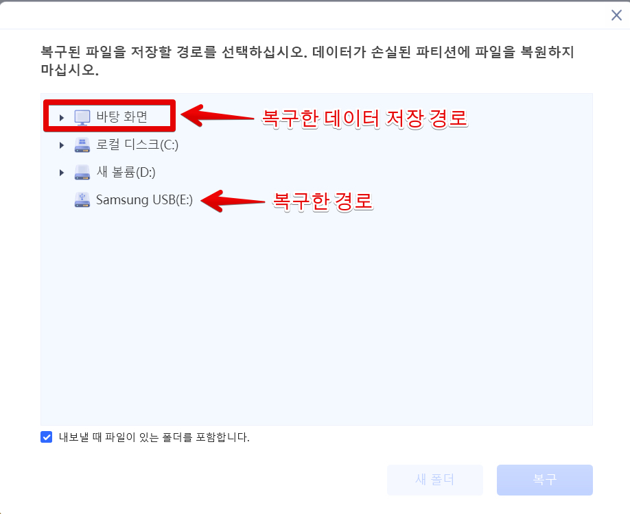파일 선택 후 복구 버튼을 누르면 복구된 파일을 저장할 곳을 선택하라는 메시지가 나타납니다. 이때 복구할 데이터를 저장하는 곳은 복구한 경로가 아닌 다른 경로로 지정하는게 좋습니다. 데이터가 손실된 파티션에 파일을 복구하면 안됩니다. 그러니까 SD카드나 USB 데이터를 복구 중이라면 파일을 복구해서 저장할 땐 바탕화면 등에 저장하면 됩니다.