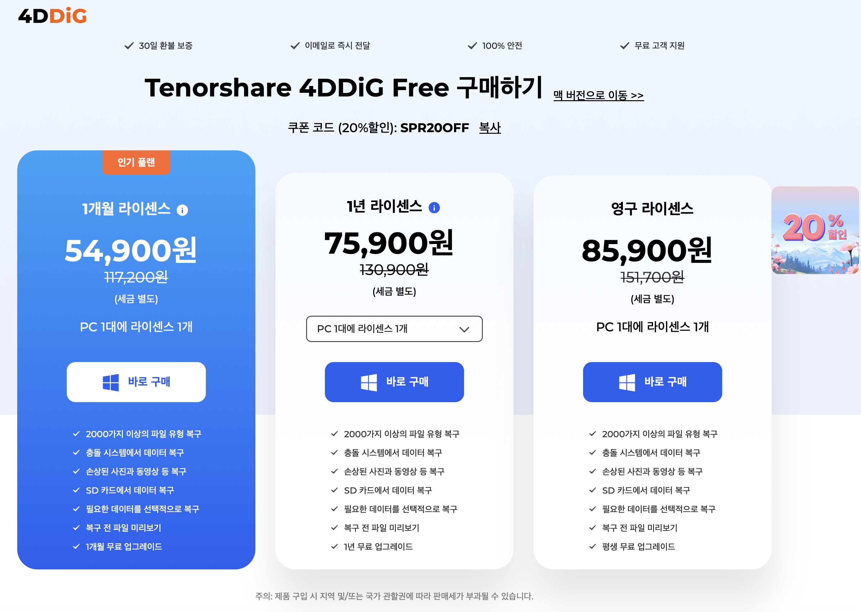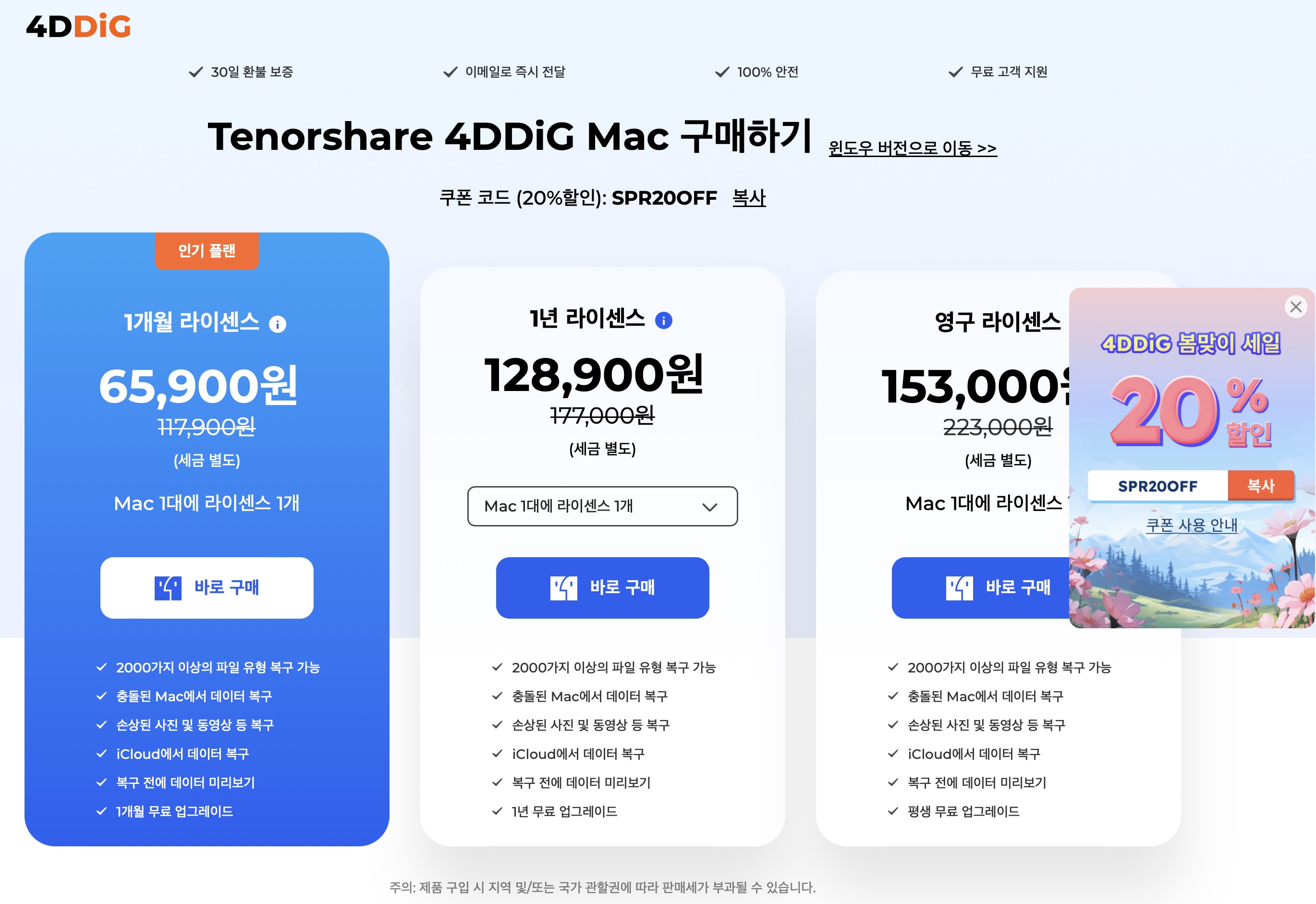 해당 프로그램은 윈도우 버전과 맥 버전 모두 제공하기 때문에 맥을 사용하시는분들에게도 유용할 것 같습니다. 1개월 라이선스와 1년 라이선스, 그리고 영구 라이선스가 있는데 가격이 합리적이라서 데이터의 소중함을 생각해본다면 가격이 적잘한 것 같습니다. 맥 버전보다는 윈도우용 버전이 조금 더 저렴하긴 하네요.