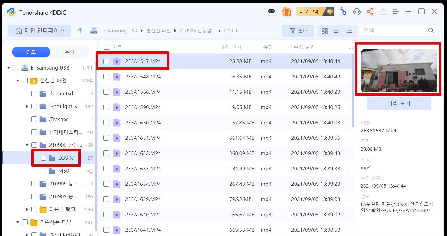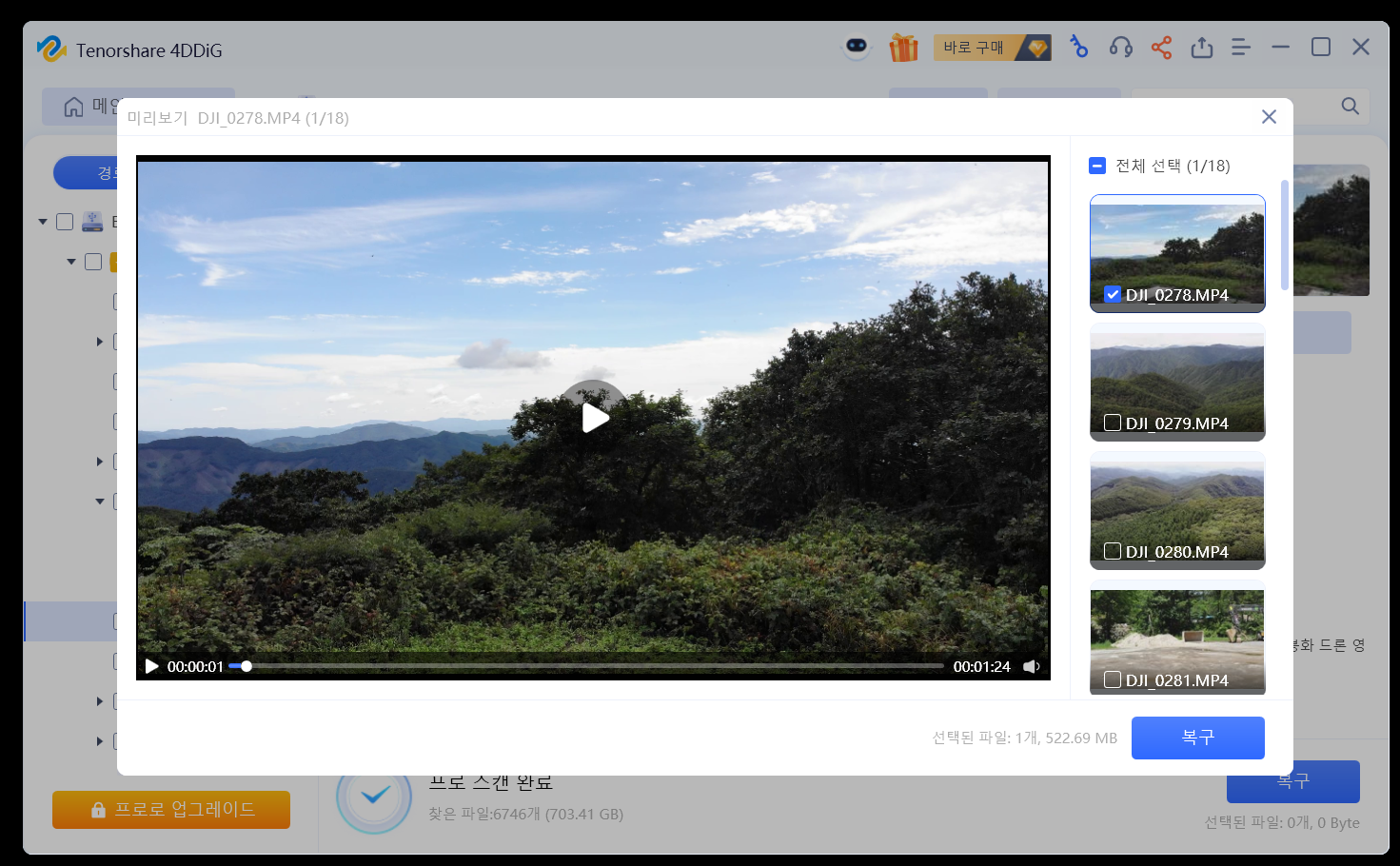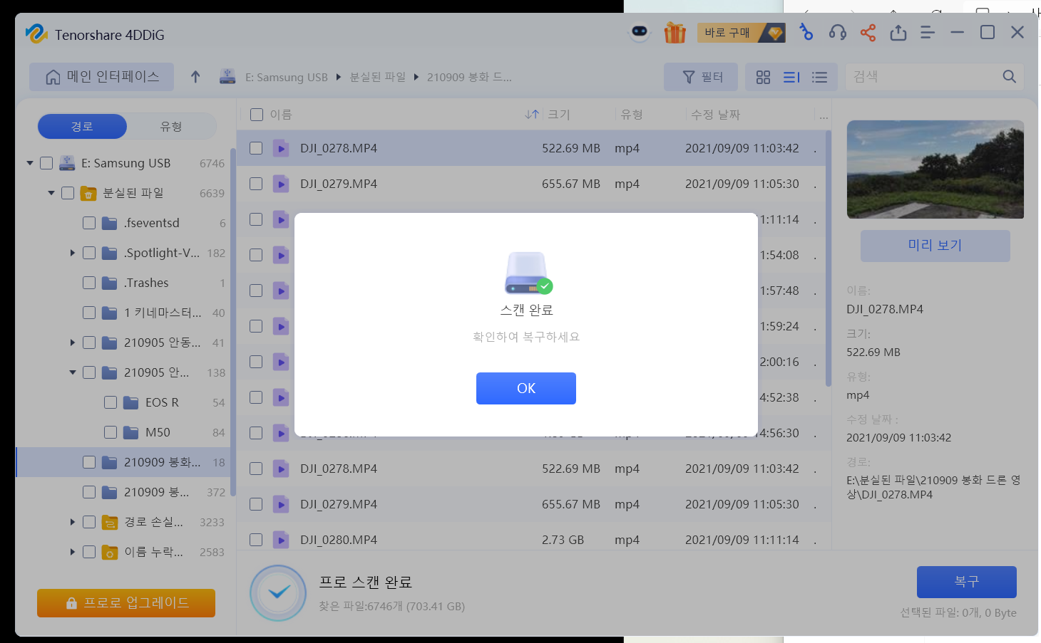 스캔되는 과정에서 이미 복구된 자료들을 볼 수 있었습니다. mp4로 된 동영상도 잘 복구되는 모습이었습니다.