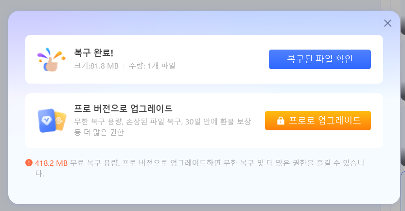 복구 완료! 최대 2GB까지는 무료로 복구도 가능하기 때문에 굉장히 유용했습니다.