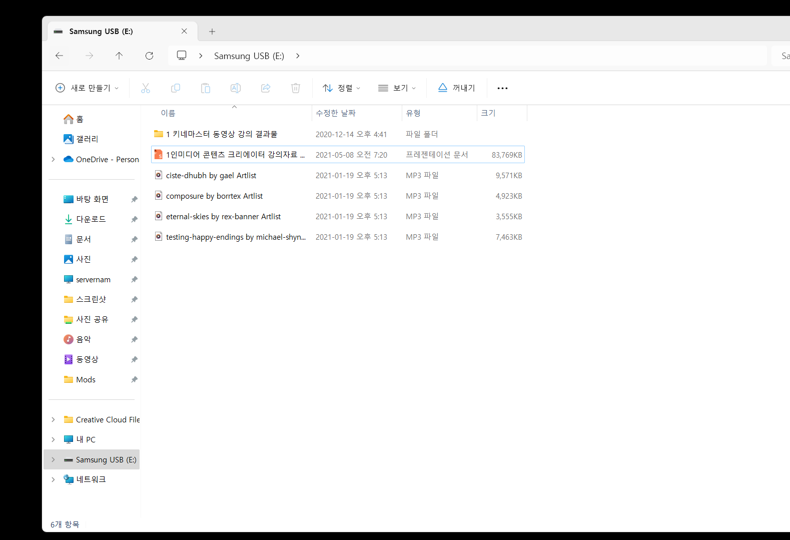 저장 장치에 기본적으로 들어있는 데이터들입니다. 음악 파일과 PPT 파일, 사진, 동영상 등이 들어있습니다.