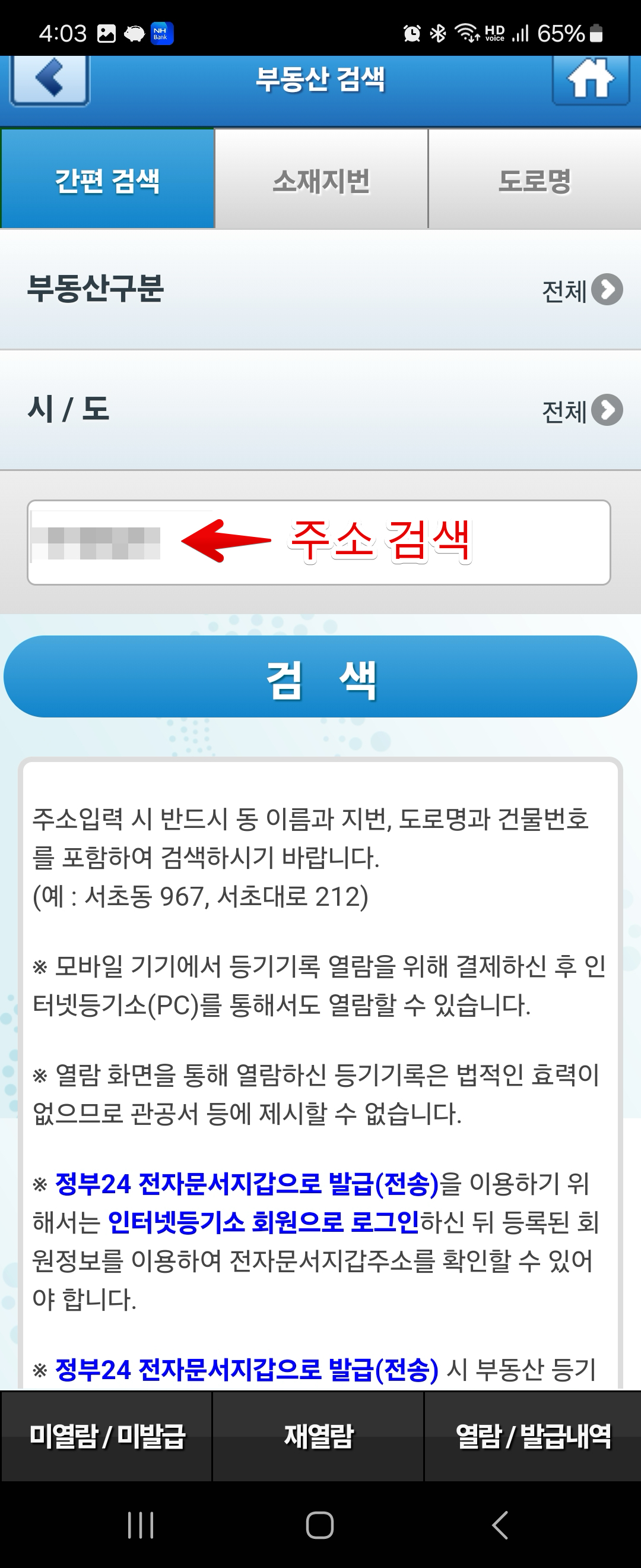 이후 등기 열람을 원하는 주소지를 정확하게 입력한 후 검색 결과를 확인합니다.