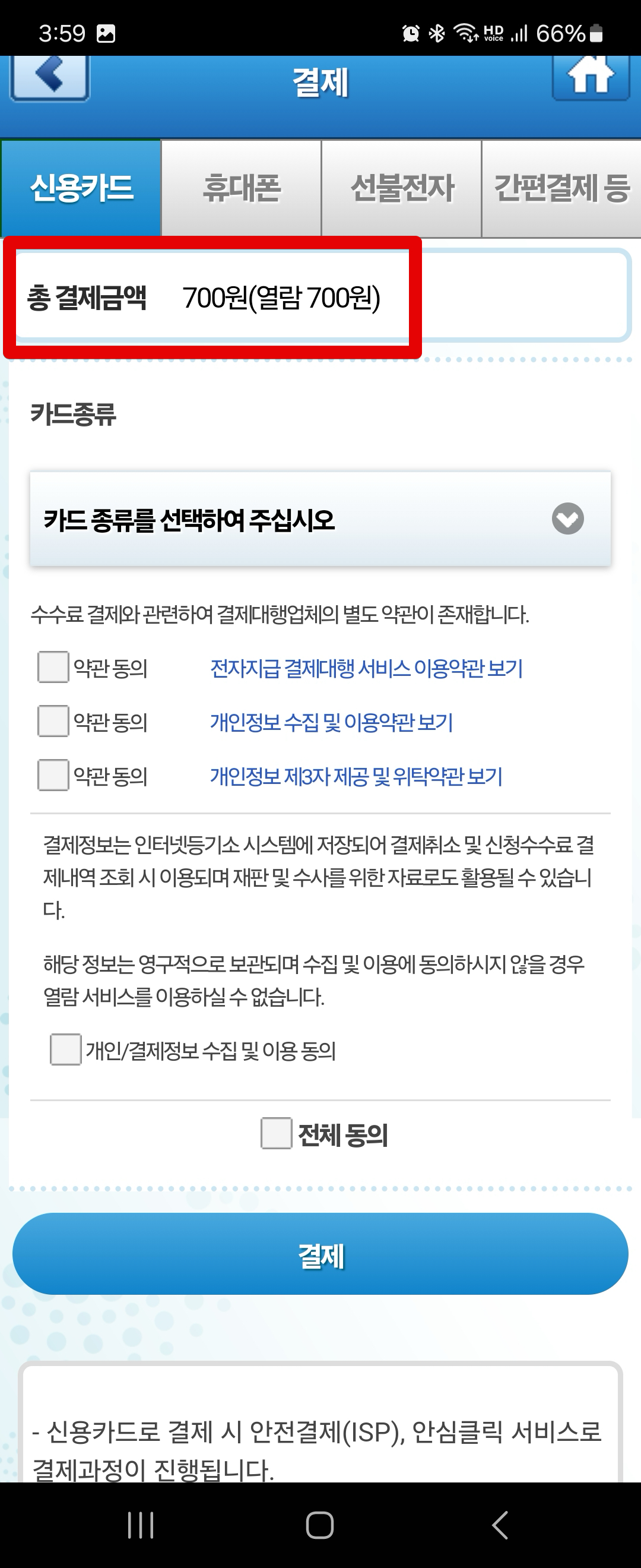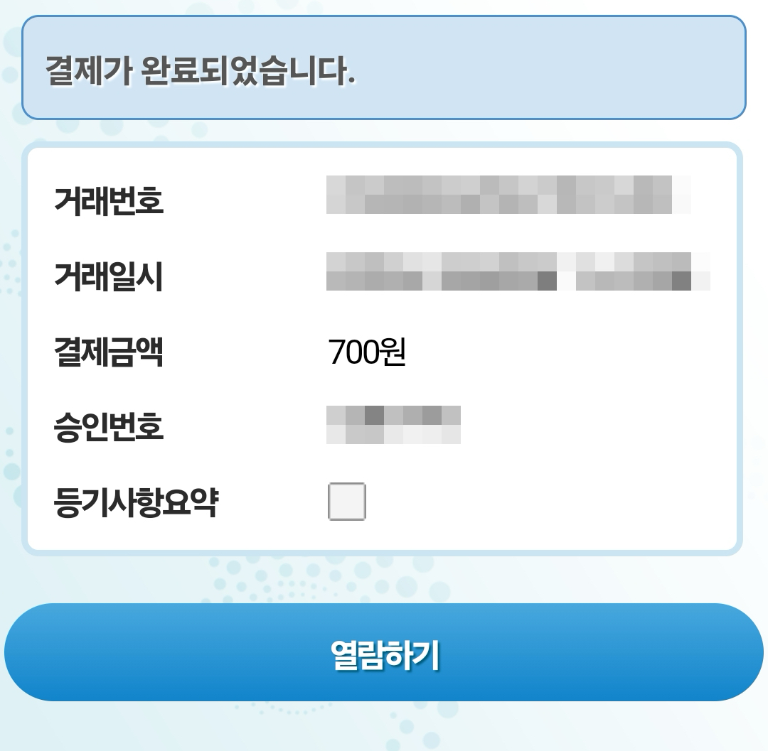 다음으로 결제를 진행합니다. 인터넷 열람용 등기부등본은 결제 700원입니다.