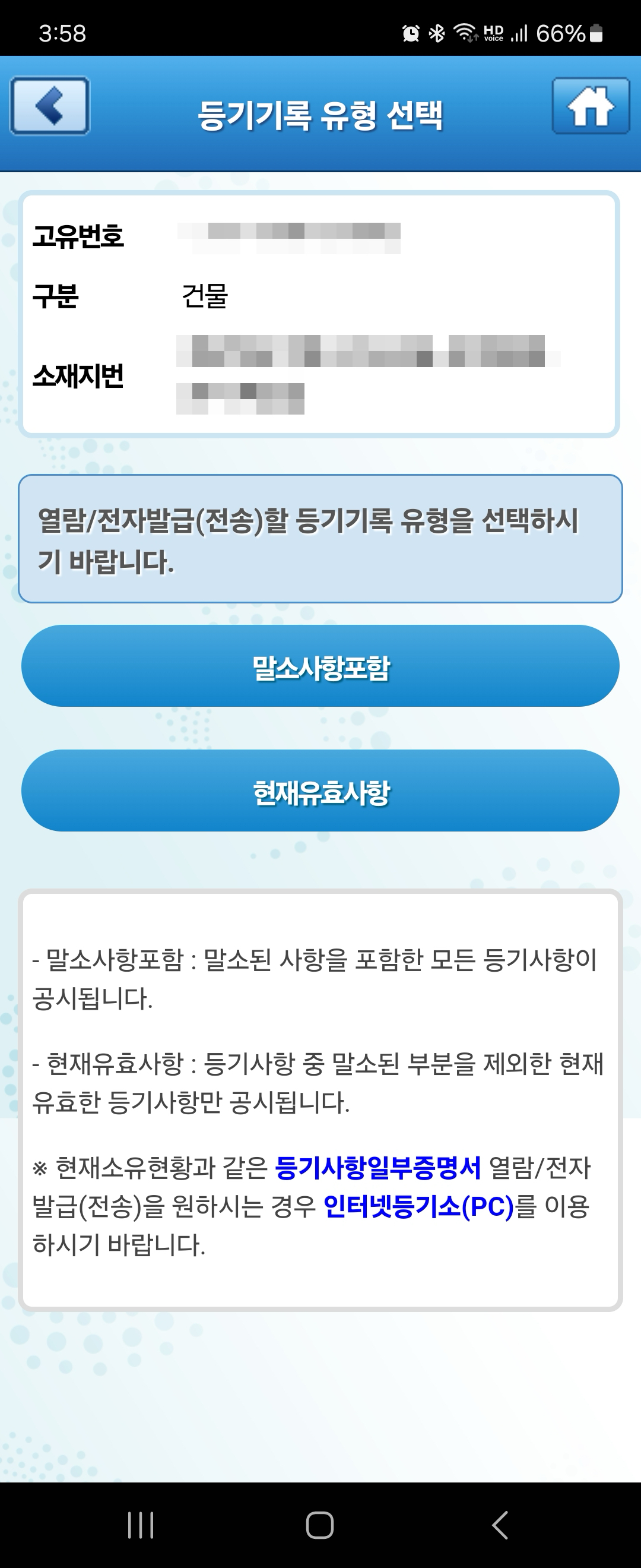 다음으로 [등기기록유형]을 선택합니다. 말소사항 포함과 현재 유효사항만 포함이 있습니다. 이후 [인터넷 등기소 앱에서 열람(화면)]을 선택하면 등기부등본 열람이 가능합니다. (열람만 가능)