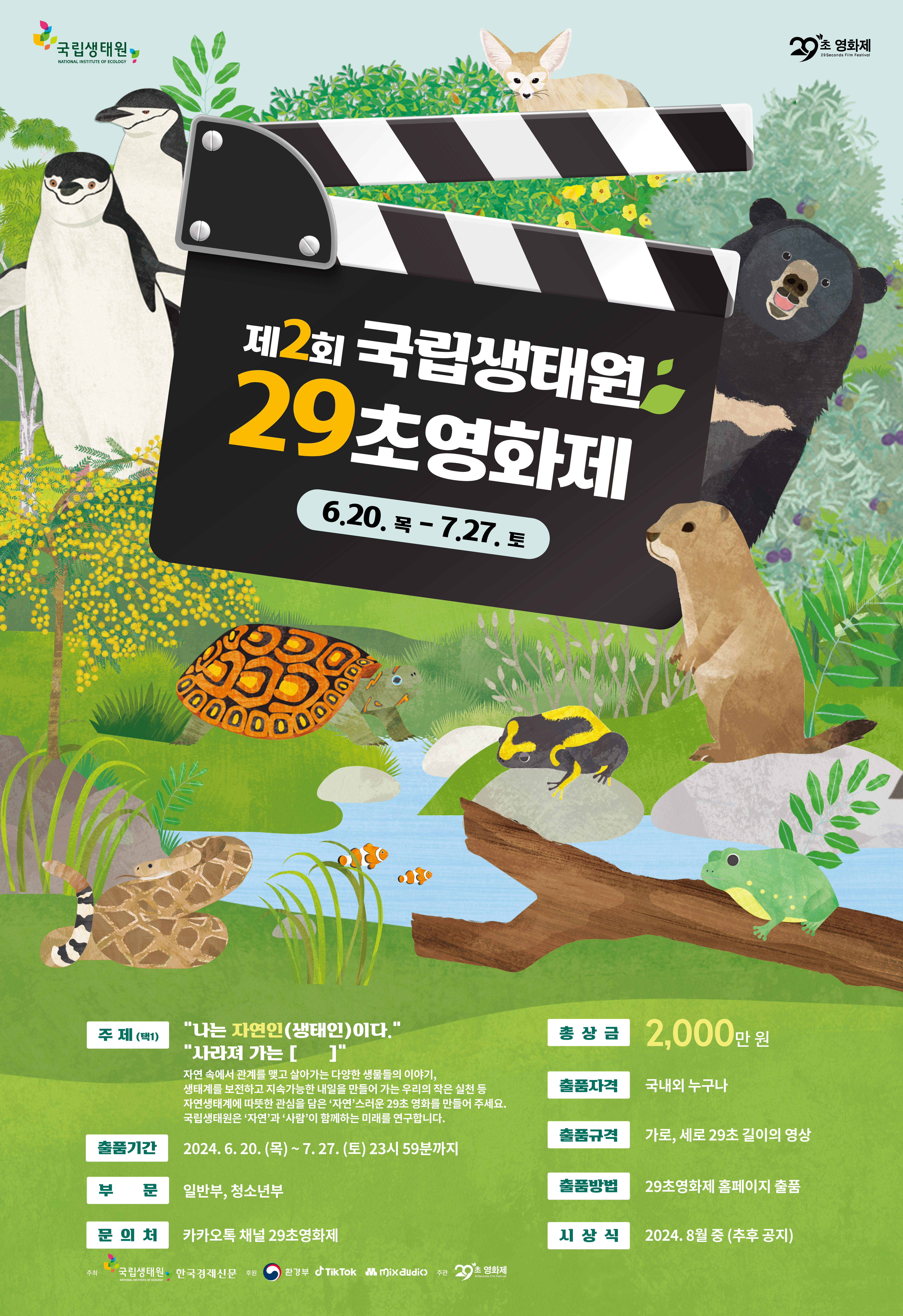 총 상금 2,000만원이 걸린 "제2회 국립생태원 29초 영화제". 국립생태원과 한국경제신문이 주최하고 환경부와 틱톡, 믹스오디오가 후원하는 영화제입니다.