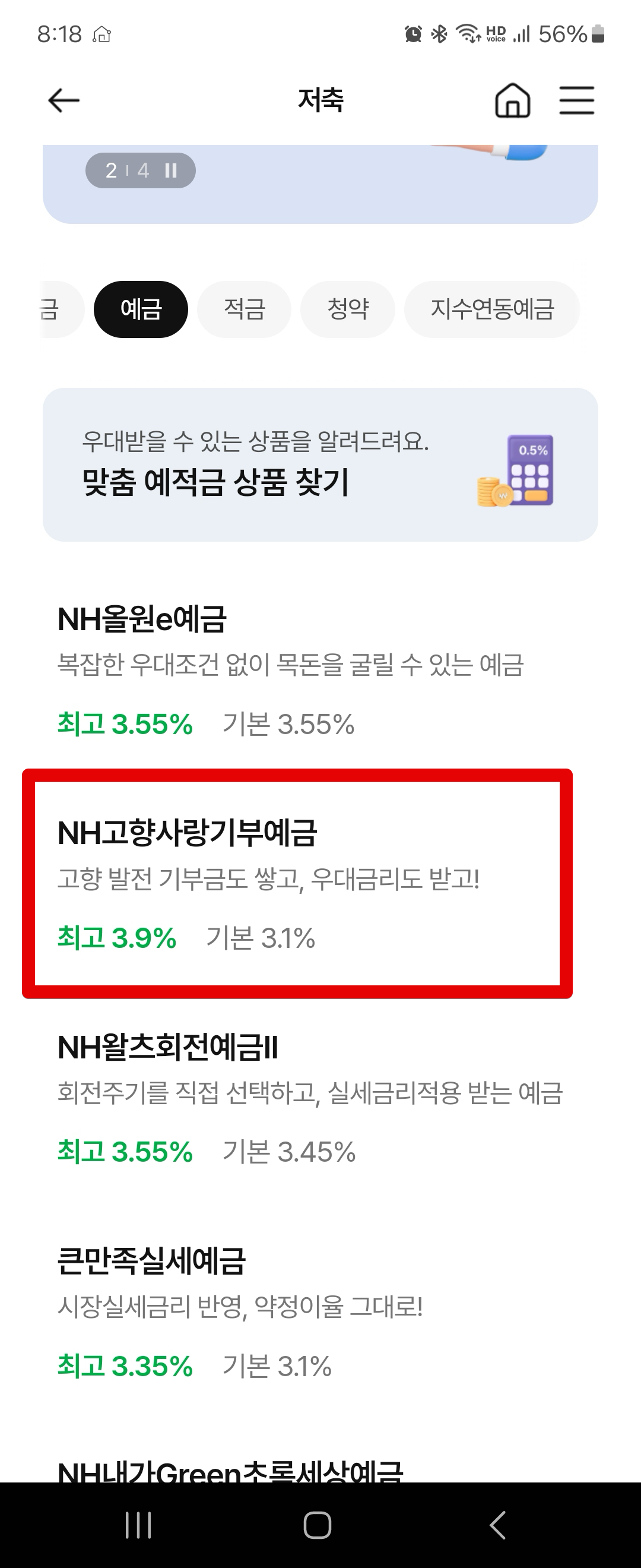 NH농협 앱에서 예금상품들 목록을 살펴보면 최고 금리 기준으로는 현재 고향사랑기부예금이 가장 나은 결과를 보여주고 있습니다. 과거에 기준 금리가 인상될 시기에는 NH고향사랑기부예금이 3.9%이고 다른 예금들도 3.9% 수준이라서 크게 메리트 있다고 느껴지지 않았었는데 다른 예금 상품들은 금리가 내려갔는데 NH농협사랑기부예금의 경우 금리가 그대로 유지되고 있고 어느정도 고향이라고 하는 지역에 사회공헌하는 개념도 들어가 있다보니까, 지금은 다른 예금 금리에 비해 꽤 높은 금리를 받을 수 있는 예금 상품입니다.