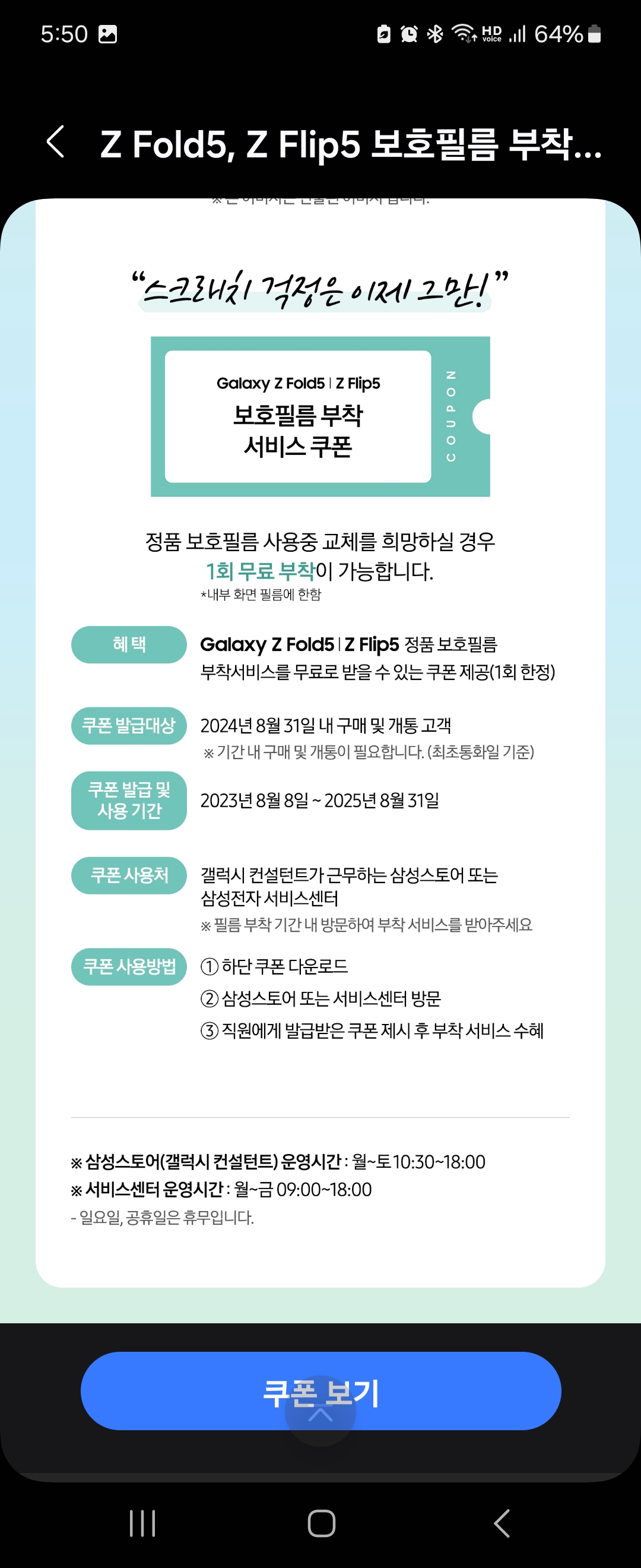 삼성 Z플립5 정품 보호필름 무료부착 서비스 받은 후기(삼성스토어)