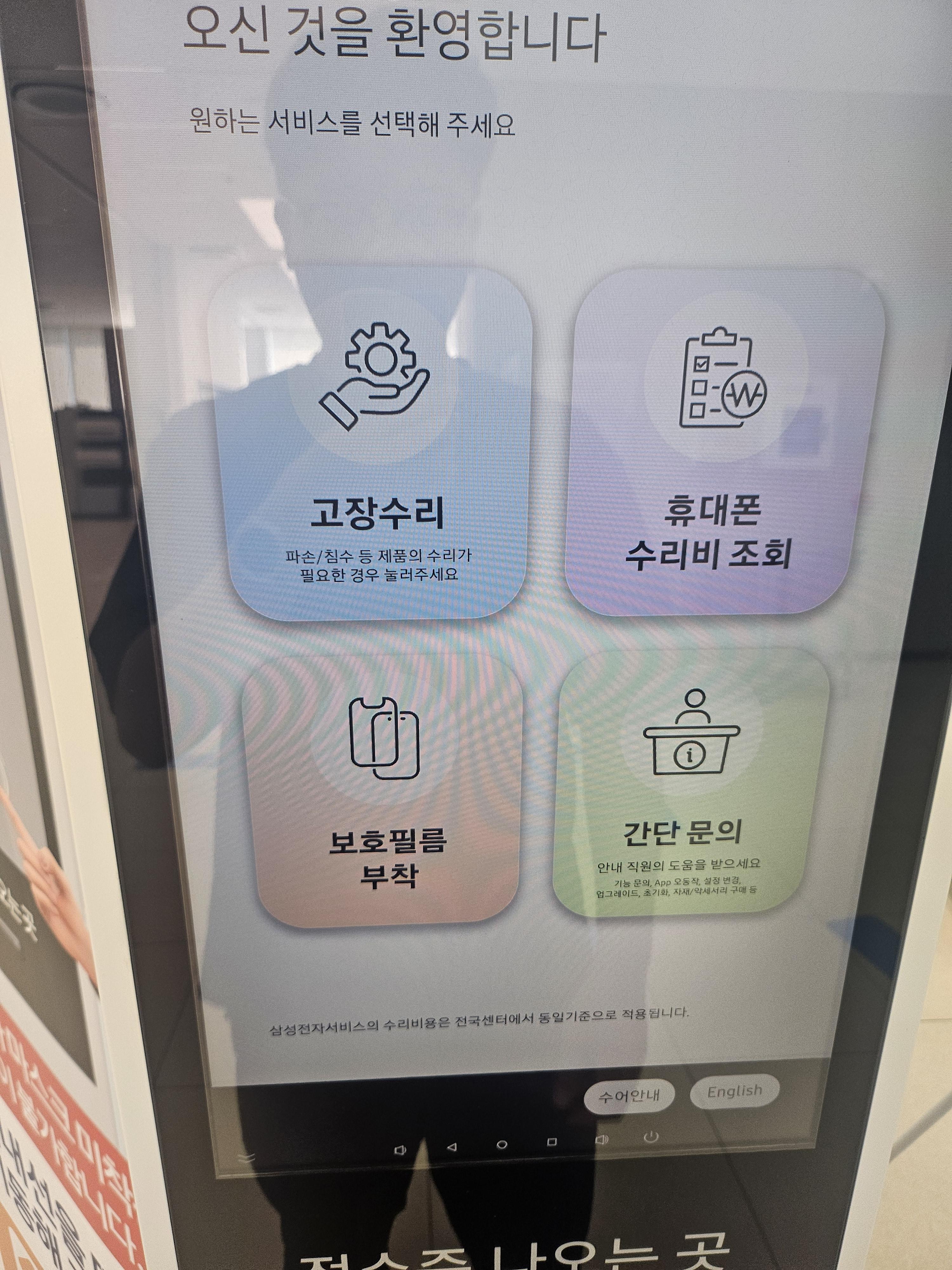입구쪽에 키오스크가 있는데 여기에서 [보호필름 부착]으로 잡고 접수증 받으면 됩니다.
