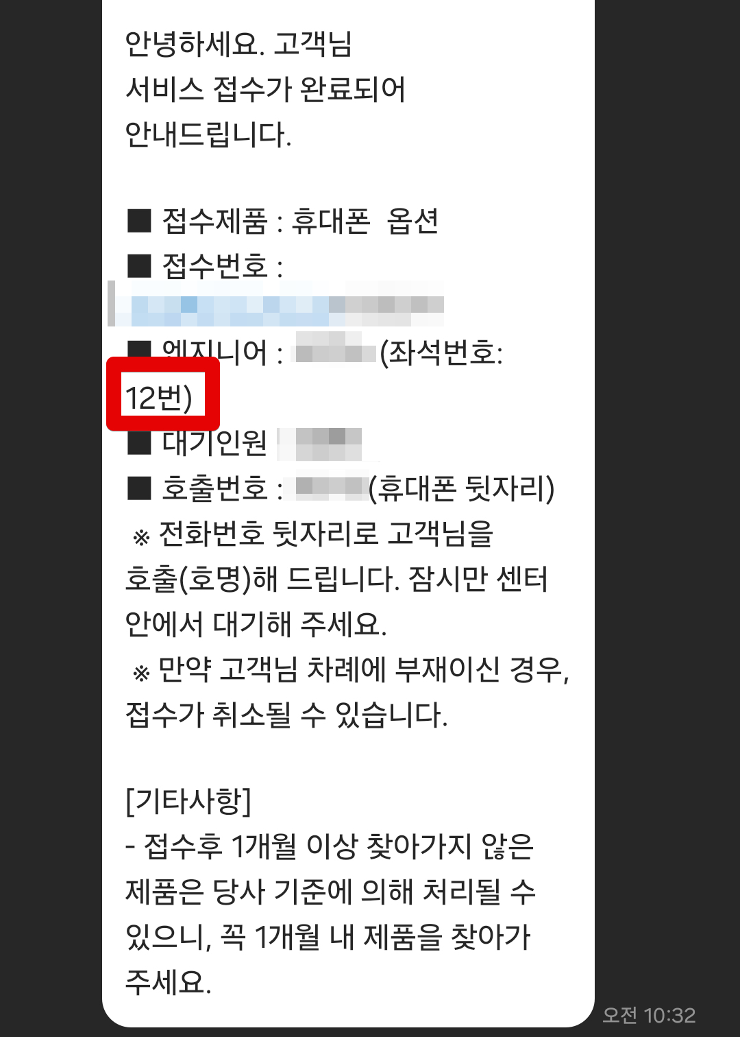 접수증 받자마자 카톡으로 이렇게 알려주는데요. 위에보면 엔지니어 번호가 있고 각 자리마다 번호표가 있어서 그 번호 앞에서 기다리면 되는 시스템이더라고요. 예전보다 좀 편리해진것 같아요.