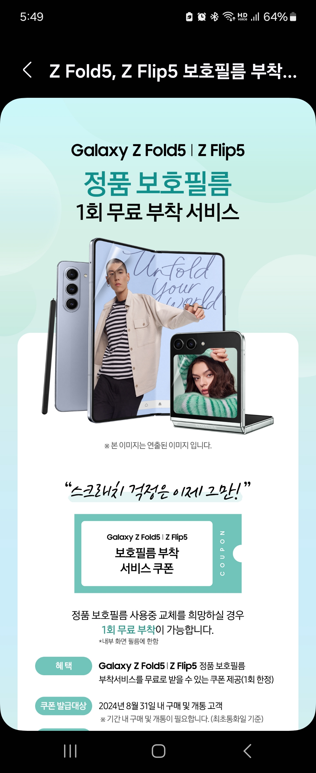 삼성멤버스 앱에 들어가서 [혜택]에 들어가보시면 위 이미지처럼 정품 보호필름 교체 1회 무료 이용권을 줍니다. 2023년 8월부터 2025년 8월까지 사용기간이므로 사용기간 중에 쓰시면 되는데요. 저처럼 1년정도 쓰셨을 때 한번즘 교체해주면 좋을것 같긴해요. 미리 삼성멤버스 앱에서 [쿠폰 다운로드]해두고 가시는걸 추천합니다.