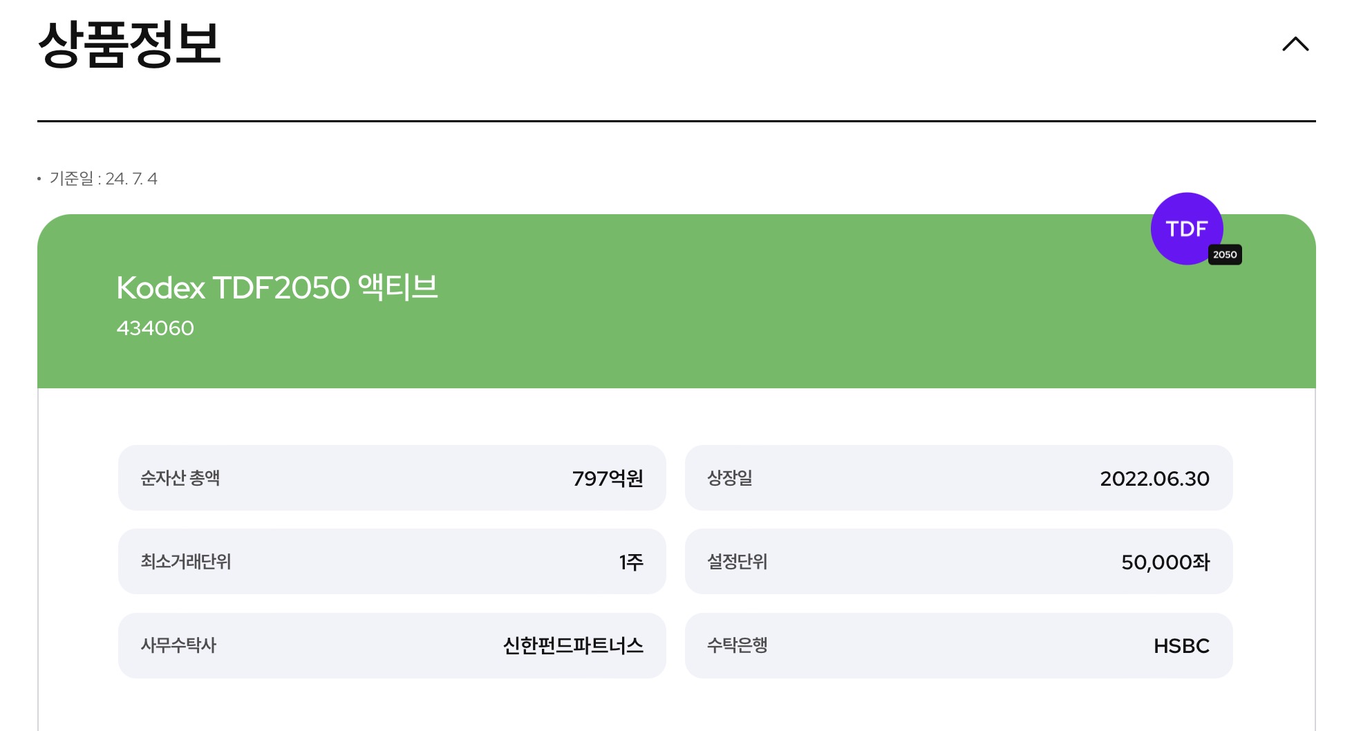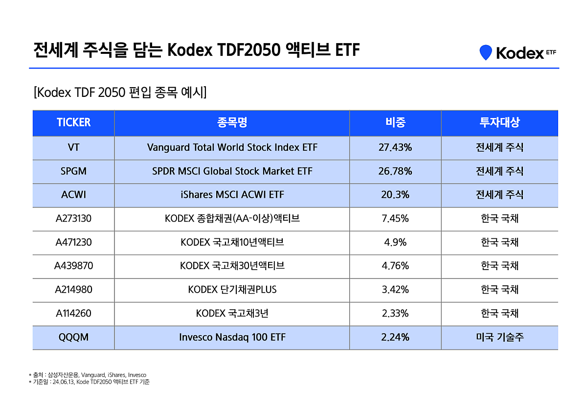 그래서 위에 나와있는 상품 TDF 2050이라고 돼 있으면, 2050년을 은퇴하는걸로 간주하고 상품 운용을 하는 TDF ETF라고 보시면됩니다. 지금 Kodex에서는 2050, 2040, 2030 상품이 나와있더라고요.