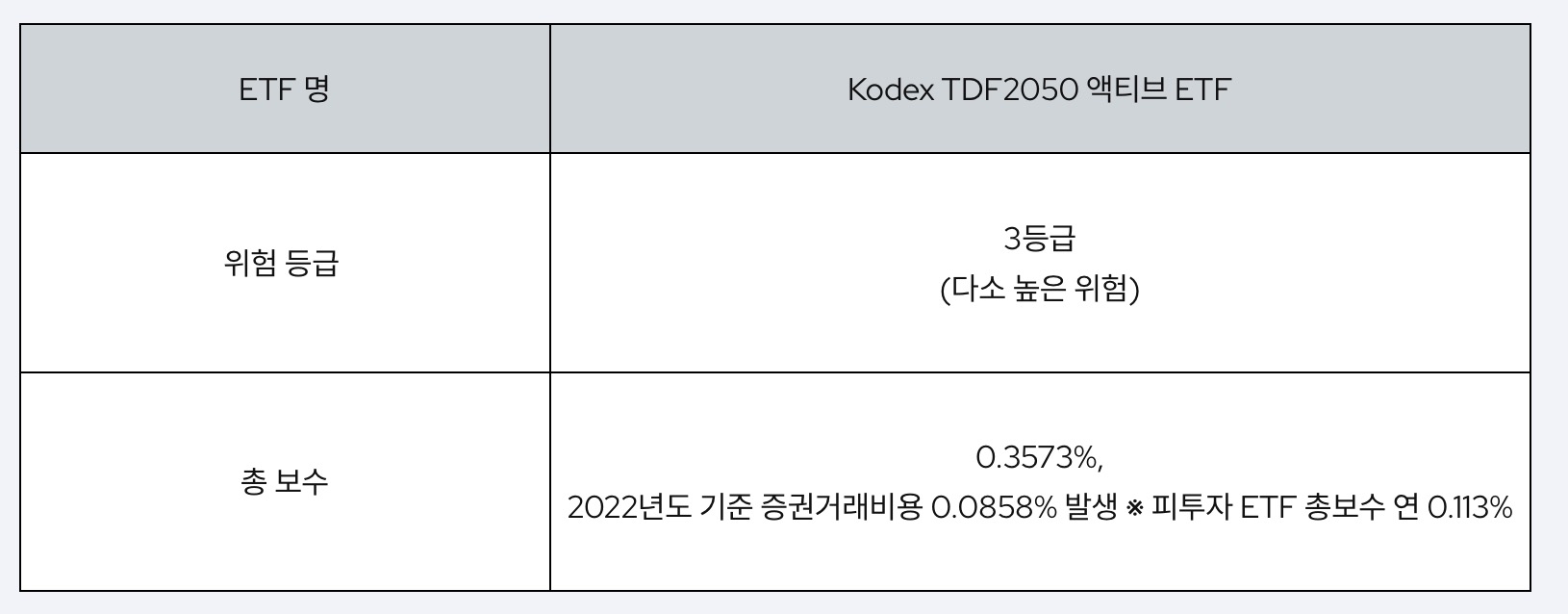 이번에 투자할 종목은 Kodex TDF 2050 액티브 상품이었는데요. 순자산 총액 약 800억원에 상장된지 2년 정도 된 ETF 상품입니다. TDF는 원래는 기존에 펀드로만 있었어서 운용보수가 0.8% 이상을 책정하고 있었어서 운용보수 문제로 부담스러워서 투자하지 않았었는데요. 이제는 TDF도 ETF로 출시되면서 운용보수를 저렴하게 가져갈 수 있어서 유용하고, 무엇보다 IRP 계좌에서 안전자산쪽에서 편입할 수 있어서 도움이 됩니다.