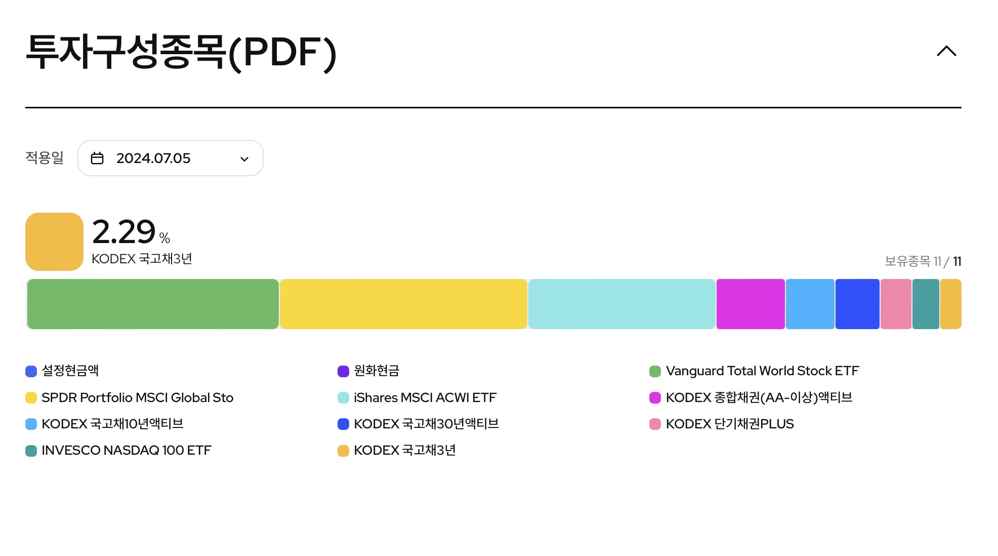 위 상품은 다음과 같습니다. 주로 해외주식들과 채권들로 구성돼 있고, 나스닥 100도 포함하고 있지만 이 종목은 2% 정도만 갖고 있어서 큰 비중은 아닙니다.