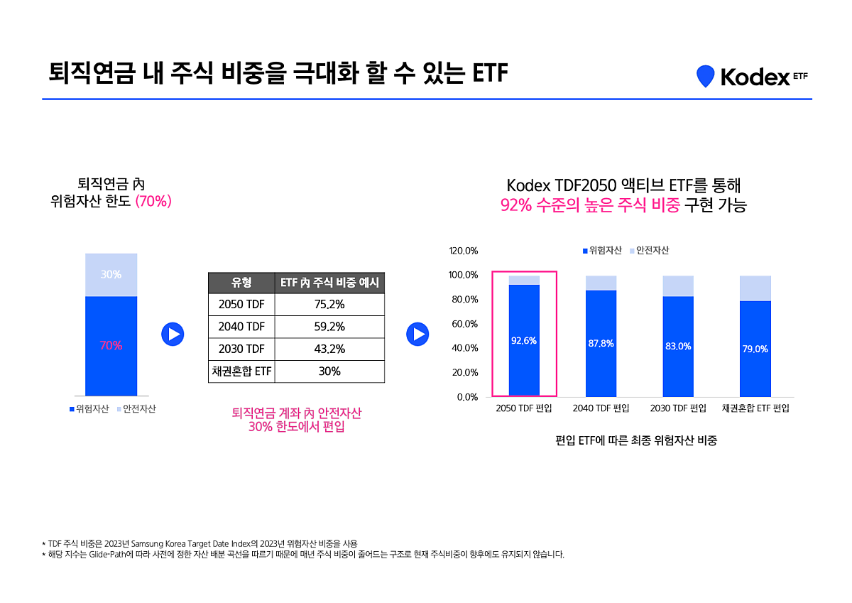 안전자산 30% 룰이 있는 IRP 계좌에서 TDF ETF 상품의 중요성은 위 이미지를 보시면 되는데요. 퇴직연금계좌에서는 안전자산 30% 룰 때문에 공격적인 투자가 많이 제한이 되는데, 이것을 해결하는 방법 중 하나로 TDF를, 그것도 ETF로 구성해서 편입할 수 있다는게 장점입니다.