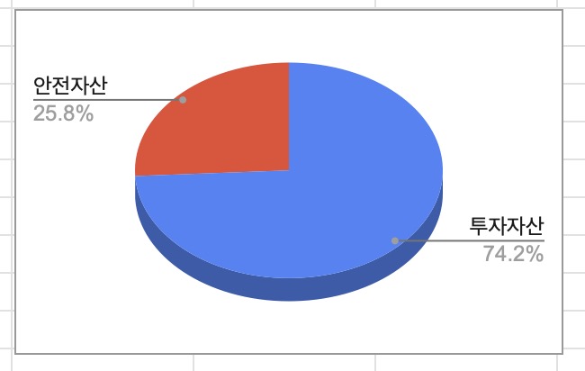 부동산을 안전자산에 포함해서 다시 계산을 하게되면 위와 같은 그래프가 나타나게 됩니다. 처음 계산할 땐 부동산을 빼놓고 금융자산들로만 그래프를 만들다보니 안전자산의 비중이 실제 제가 가지고 있는 자산에 비해 낮게 나온 것이었습니다.