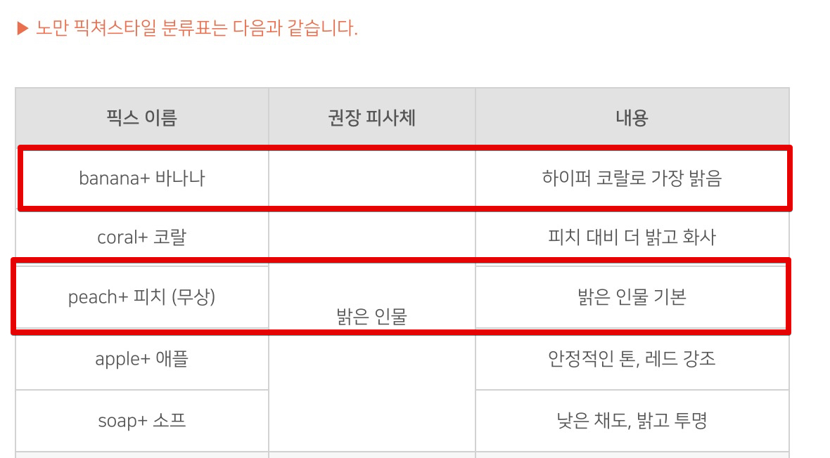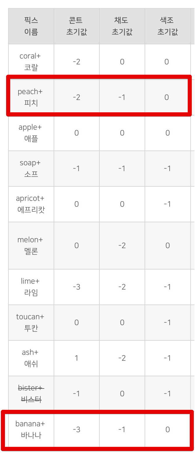 값에 대한 설명을 확인해보면, 피치+보다 바나나+쪽이 콘트라스트가 -1로 더 낮게 들어가 있습니다. 그런데 -1차이라서 그런지 실제로 눈으로 볼 땐 거의 차이를 느끼기가 어렵고 콘트라스트 같은 기술적인 숫자보다는 실제로 촬영을 했을 때 사진 전체에서 오는 감각적인 느낌에서 바나나+쪽이 조금 더 예쁘게 나온다고 개인적으로 느끼고 있습니다.