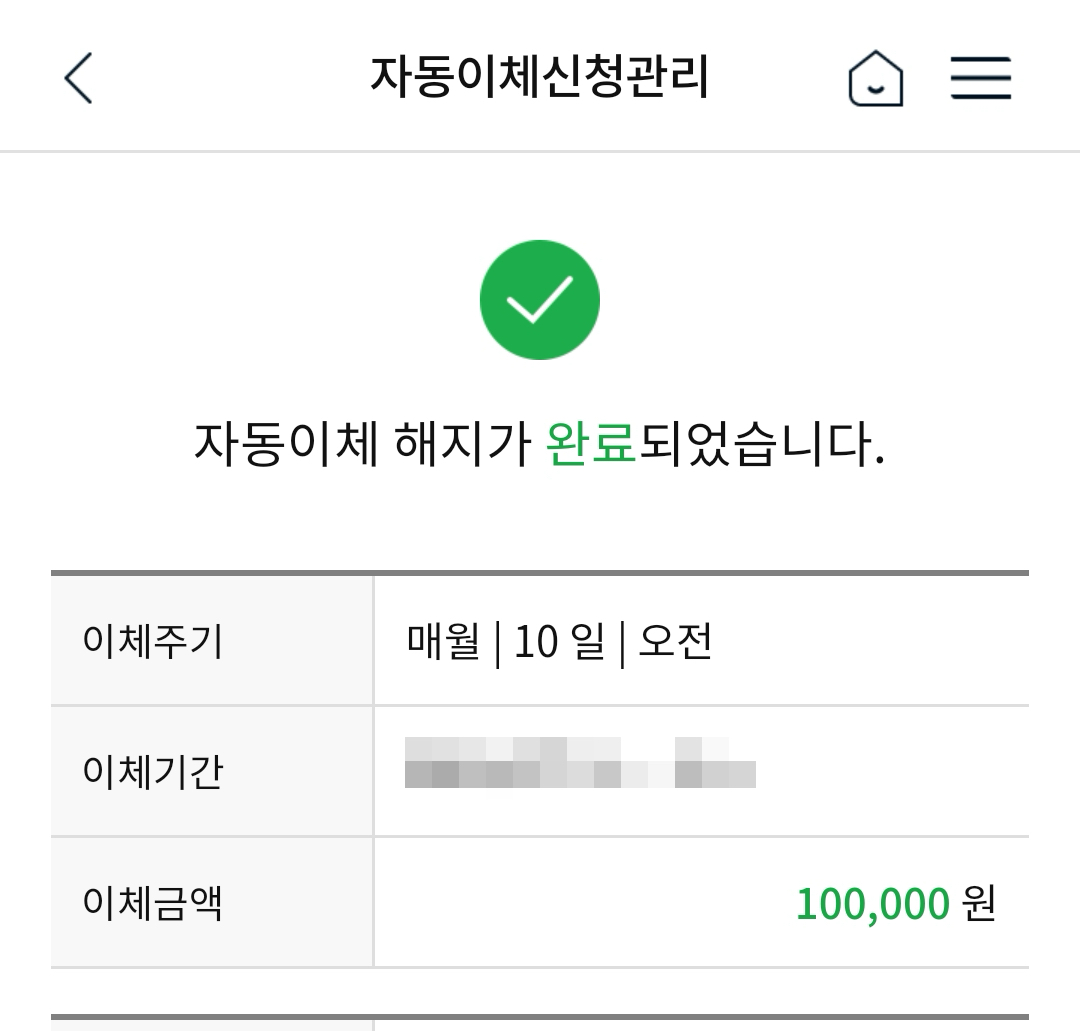 해지를 선택하게 되면 자동이체 해지가 완료됩니다. 제가 직접 해보니까 이때 납입일 기준으로 앞뒤로 2영업일 정도가 필요하다고 합니다. 예를들어 10일에 납입되었다면 12일이나 13일에 자동이체 해지를 할 수 있었습니다. 까먹지말고 자동이체 해지 해주면 될 것 같습니다.