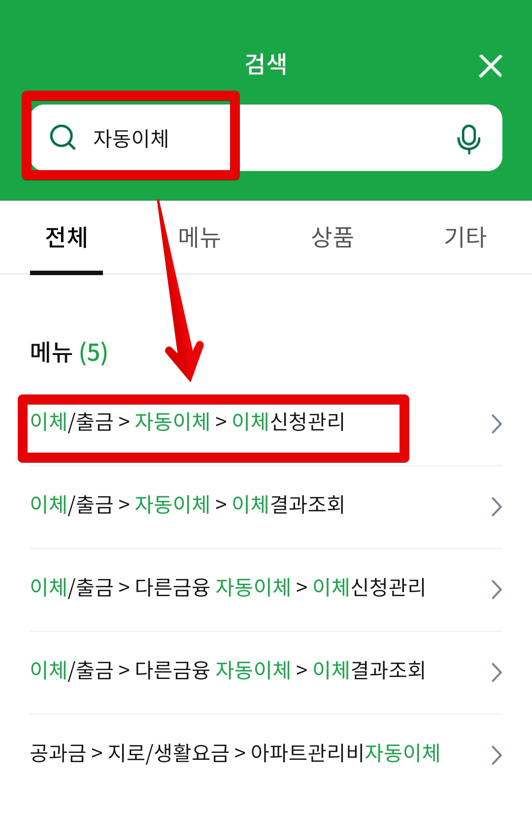 전체 메뉴에서 검색창에 [자동이체]라고 검색하면 아래쪽에 [이체신청관리] 메뉴가 나타나고 여길 클릭합니다. 이후 주택청약통장 계쫘를 선택해서 자동이체 구분을 조회합니다.