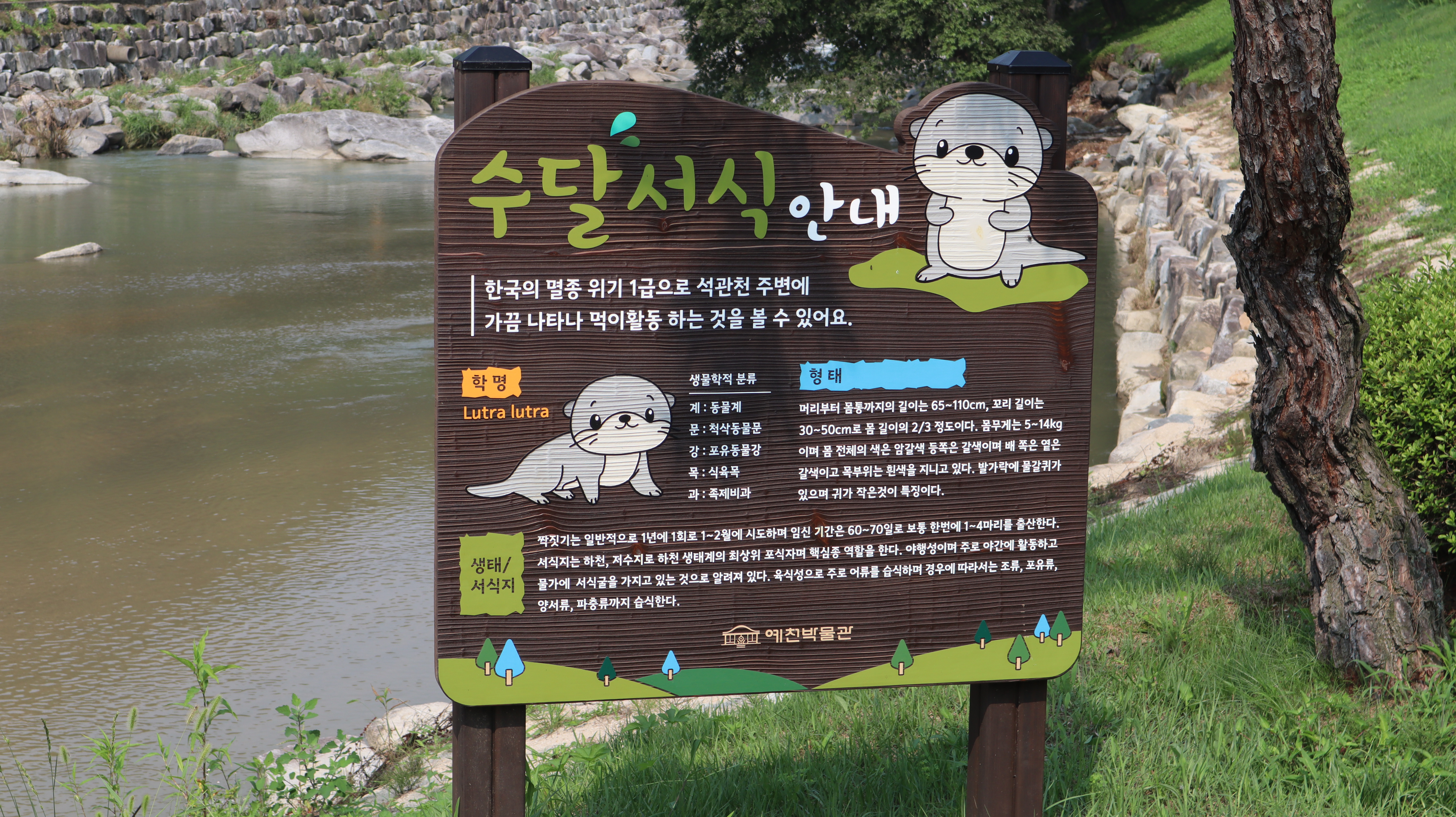 수락대 앞은 수달서식 안내 표지판이 있었는데요. 한국의 멸종 위기 1급으로서 가끔 나타나서 먹이활동 하는걸 볼 수 있다고 하네요.