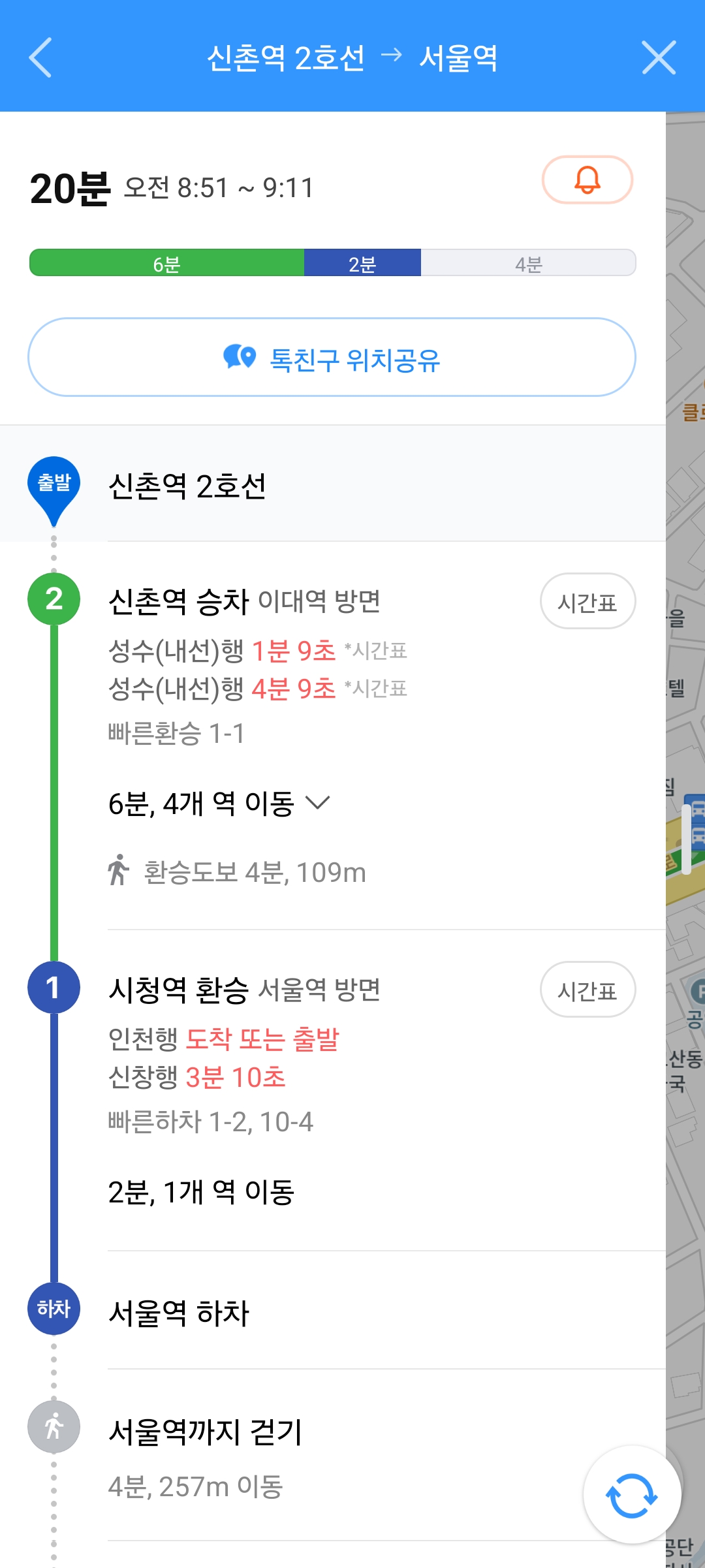 카카오맵에서 출발지 + 도착지를 지정하게 되면 위 그림처럼 동선을 볼 수 있고 도착 예정 지하철의 남은 시간과 함께 OO행인 지하철을 볼 수 있어서 헷갈리지 않고 탑승이 가능합니다. 지금까지 자주 서울 출장 여기저기 다니고 있습니다만, 카카오맵의 저 정보를 이용했을 때 단 한번도 지하철을 잘못 탄 적이 없었습니다. 빨간색 종 모양을 클릭하게 되면 하차 알림도 받을 수 있습니다.