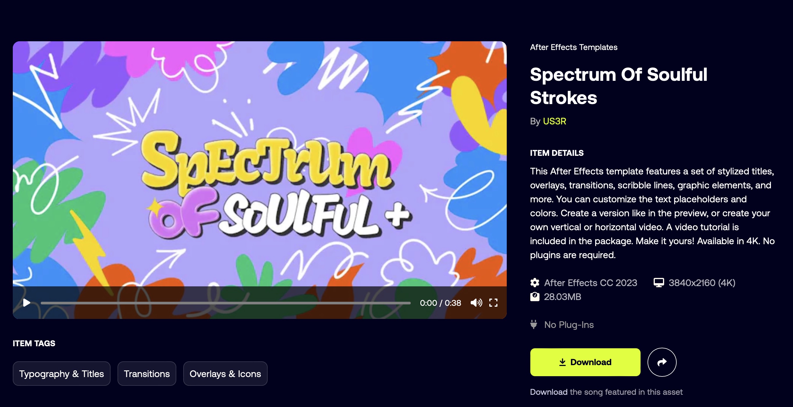 스펙트럼 오브 소울풀 스트로크는 밝은 느낌을 주는 다채로운 여름 분위기의 요소 세트입니다. 20개의 화살표 애니메이션과 애니메이션 모양, 10개의 타이틀 요소와 5개의 화면전환효과를 갖고 있습니다. 4K까지 지원하기 때문에 사용하기에도 편리합니다.
