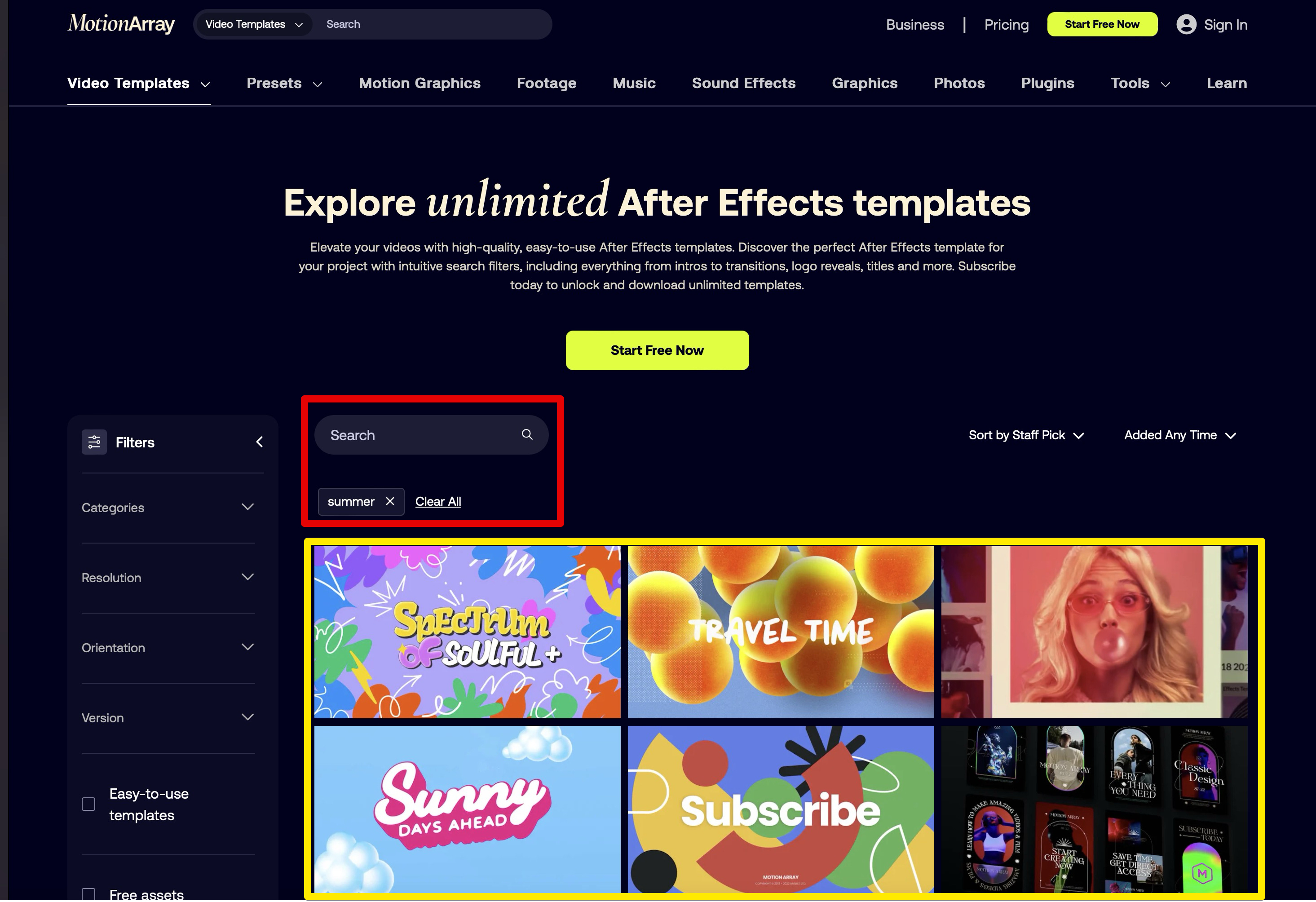 오늘 소개하는 템플릿들 외에도 모션어레이 사이트에서 애프터이펙트 템플릿을 구할 때 검색창에 'summer'라는 단어를 입력하게 되면, 여름 분위기를 내는 많은 무료 또는 유료 템플릿들을 볼 수 있습니다.