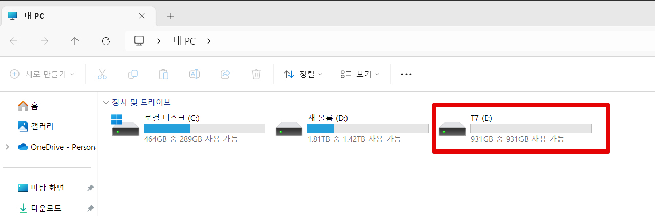 외장하드를 컴퓨터에 연결해줍니다. T7로 표시되며 처음에는 E드라이브로 잡혔습니다. C드라이브 SSD가 현재 약 500GB 이며 실제 사용 용량은 약 175GB를 쓰고 있습니다.