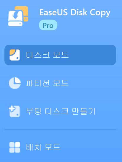프로그램 설치를 마치면 왼쪽에 메뉴가 있는데요. 순서대로 디스크 모드, 파티션 모드, 부팅 디스크 만들기, 배치 모드가 있습니다.