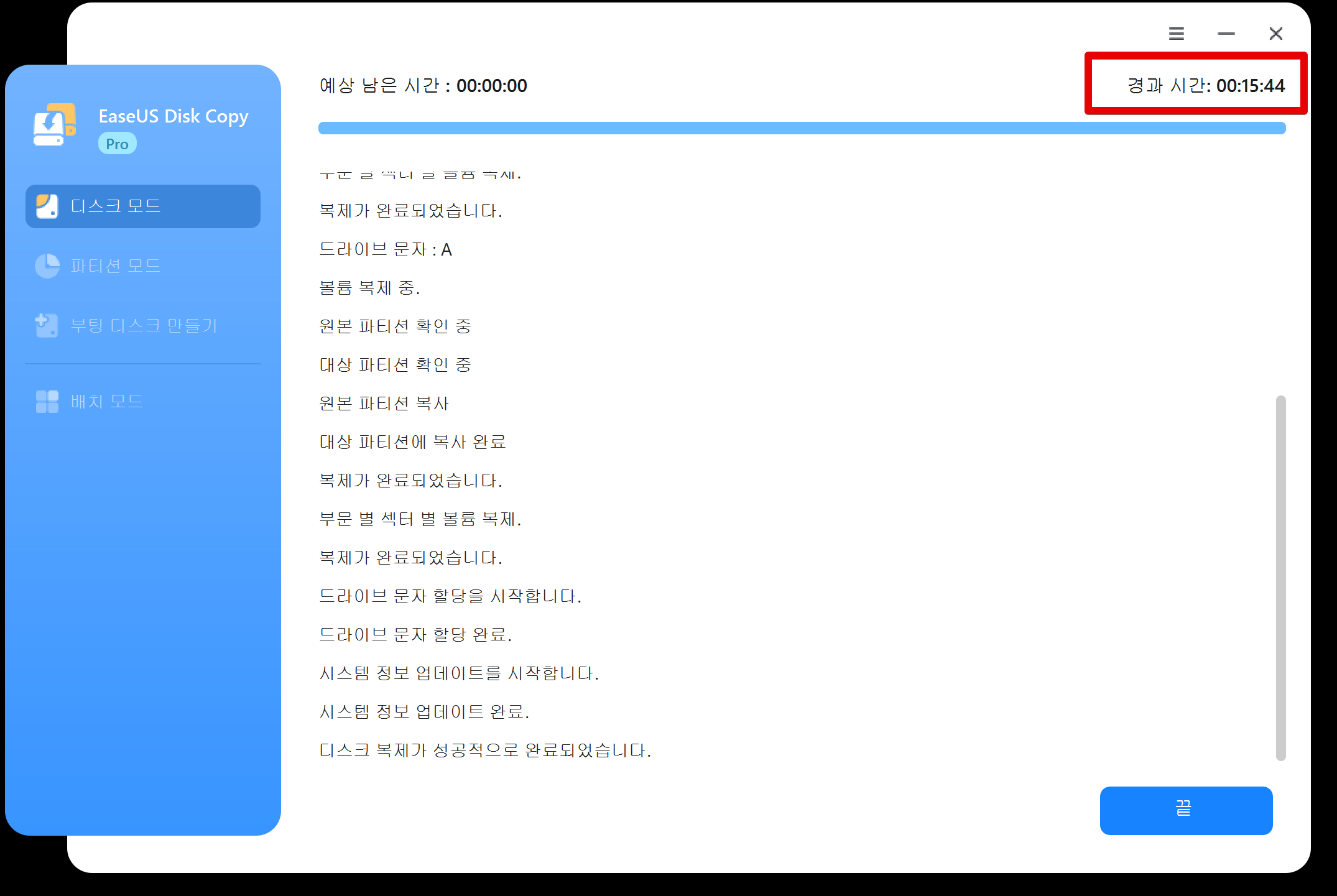 조금 기다리니 모든 백업이 완료되었습니다. 양쪽다 SSD일 경우, 약 200GB를 백업하는데 15분 정도가 소요되었습니다. (환경에 따라 시간은 달라질 수 있습니다.)