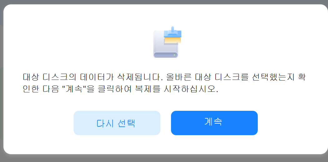 백업을 시작하면 위와 같은 메시지 창이 나타나는데요. 대상 디스크의 데이터가 삭제된다는 의미입니다. 여기에서는 외장하드의 데이터가 삭제된다는 뜻이므로 만약 백업이 저장될 디스크에 중요한 데이터가 있다면 미리 빼놓고 진행하는걸 추천합니다.