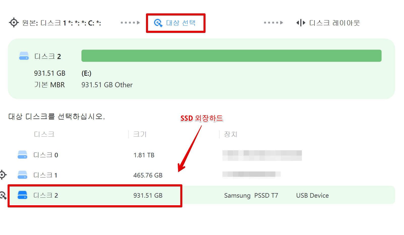다음으로 [대상 선택]이라고 나오면, 여기에는 백업이 될 대상 디스크를 선택해야합니다.(이번 글에서는 대상 디스크는 외장하드). 외장하드를 선택해줍니다.