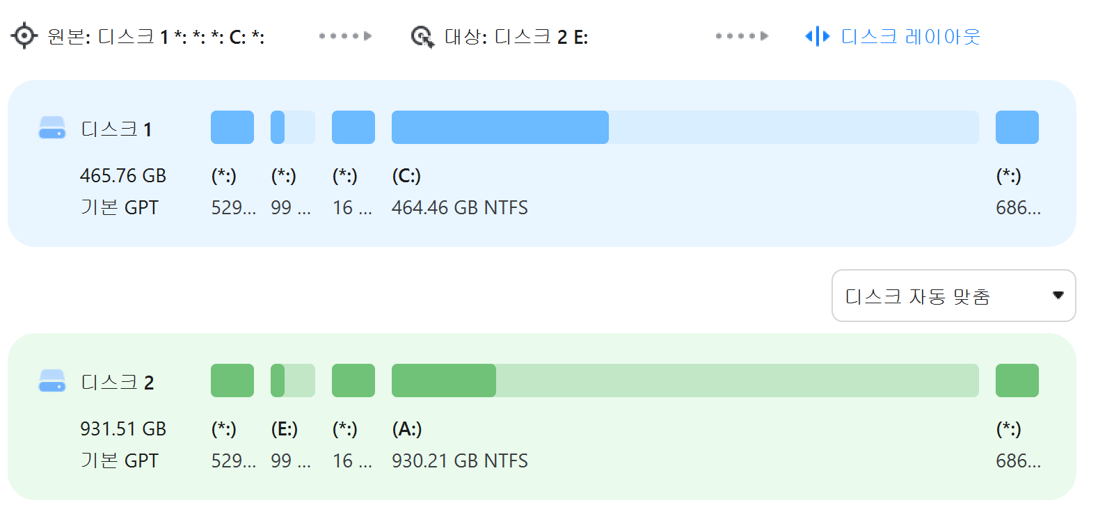 진행하기전에 소스 디스크와 대상 디스크의 내역을 보여줍니다. 기본 GPT 방식으로 양쪽다 돼 있으며 백업이 되었을 경우 어떻게 보일지 나타내줍니다.