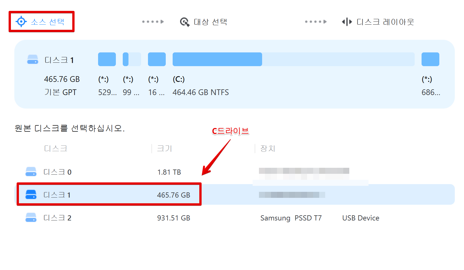 프로그램 디스크 모드에서 처음에 [소스 선택]이라고 나오는데 이때에는 백업을 할 원본 드라이브를 선택합니다. 여기에서는 C드라이브를 선택해주었습니다.