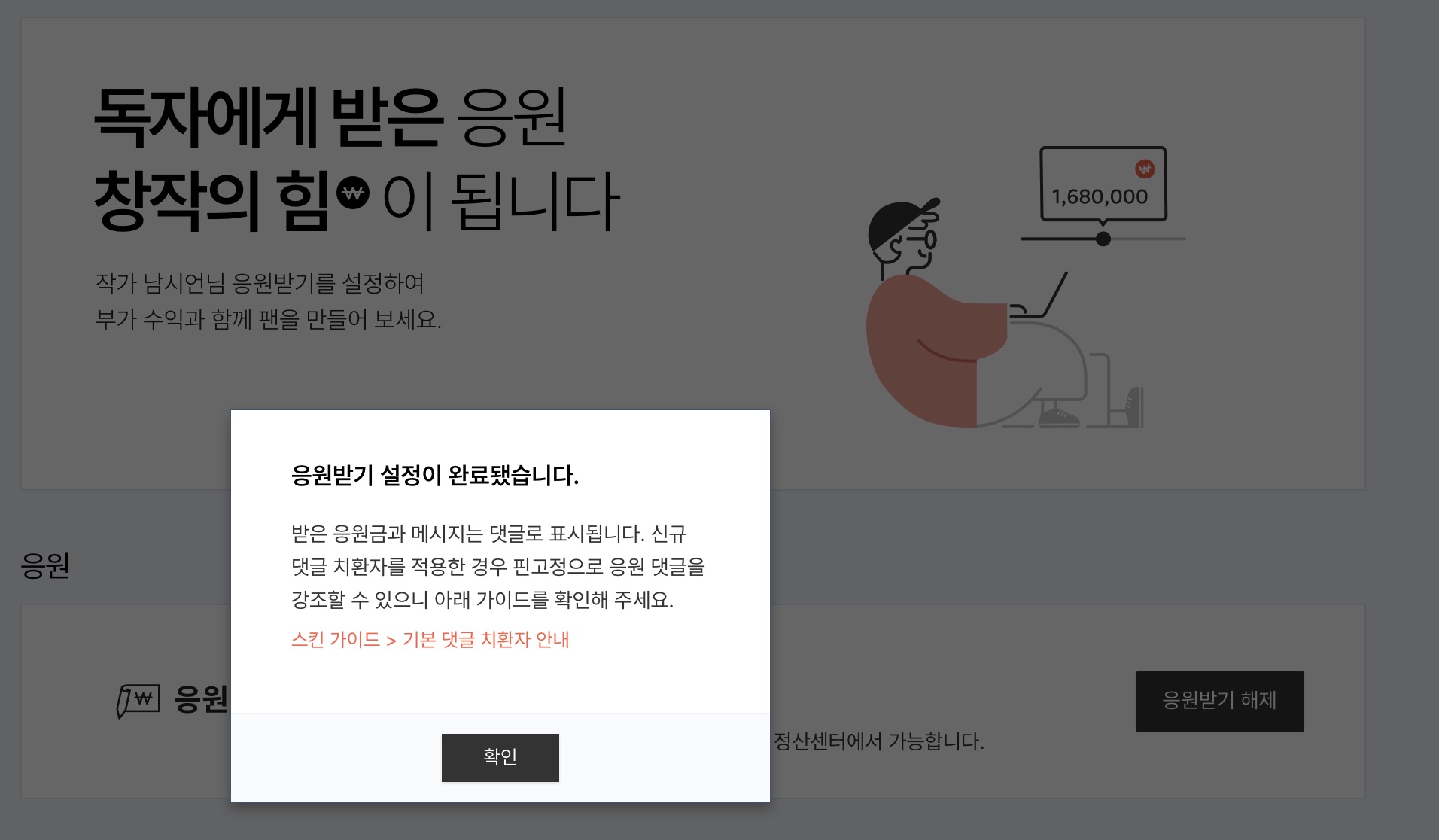 이후 티스토리 관리자 화면에서 응원받기 설정을 설정 및 완료해주어야 정상적으로 티스토리 블로그에 응원받기 시스템이 노출됩니다. 정산 설정만 하고 가만히 두니까 응원하기 버튼이 안생기더라고요.