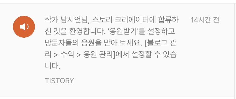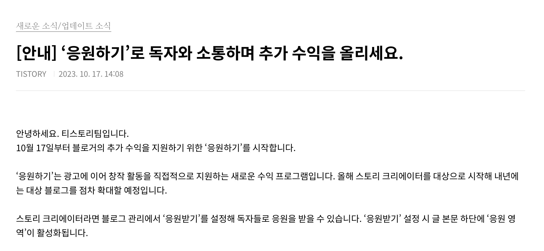 티스토리 공지사항을 살펴보게 되면, 2023년 10월 중순에 응원하기 시스템이 도입이 되었습니다.