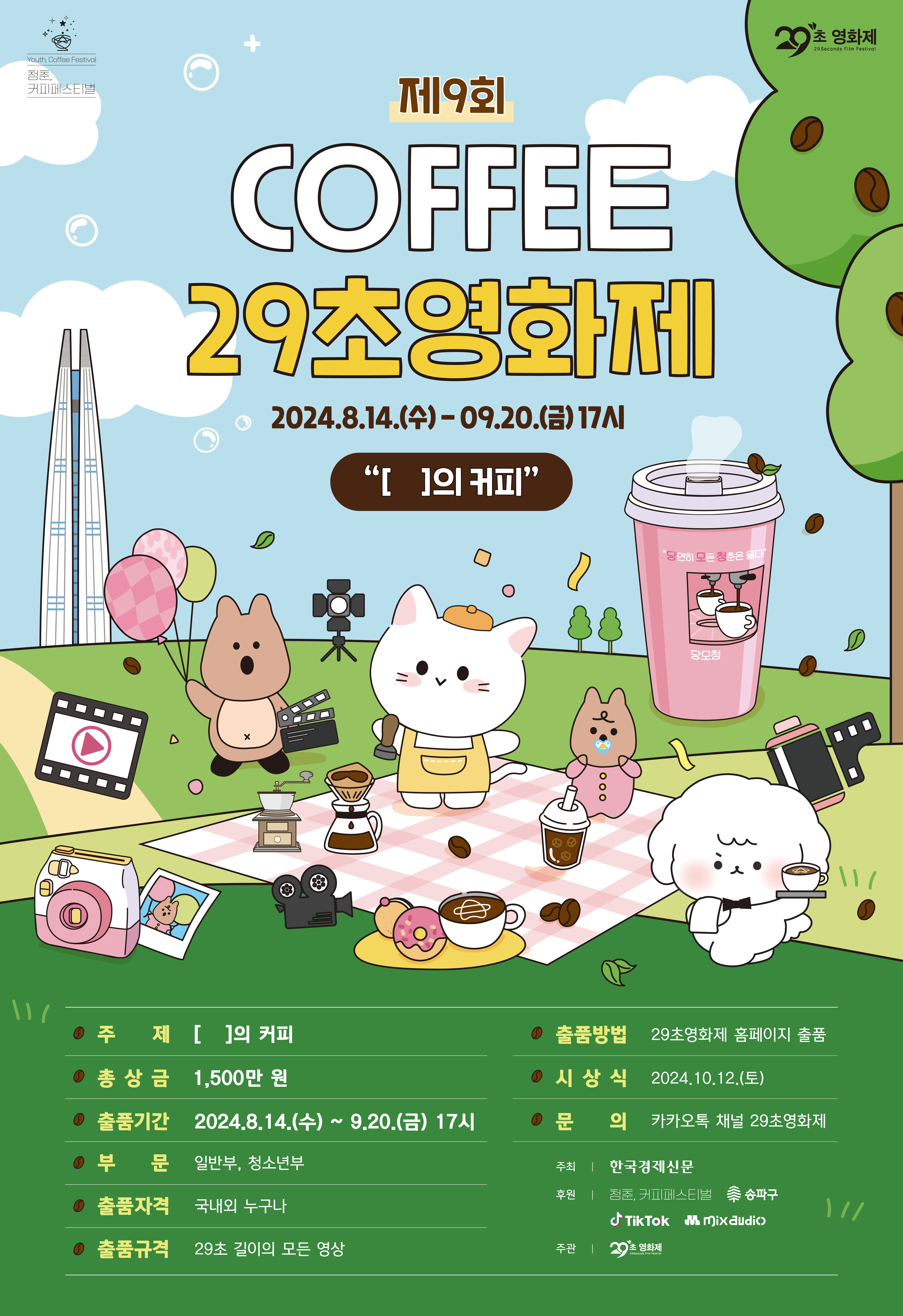 한국경제신문이 주최하고 청춘, 커피페스티벌과 송파구, 틱톡과 믹스오디오가 후원하는 이번 영화제는 ‘2024 청춘, 커피 페스티벌’과 함께 <제9회 커피 29초영화제>입니다.