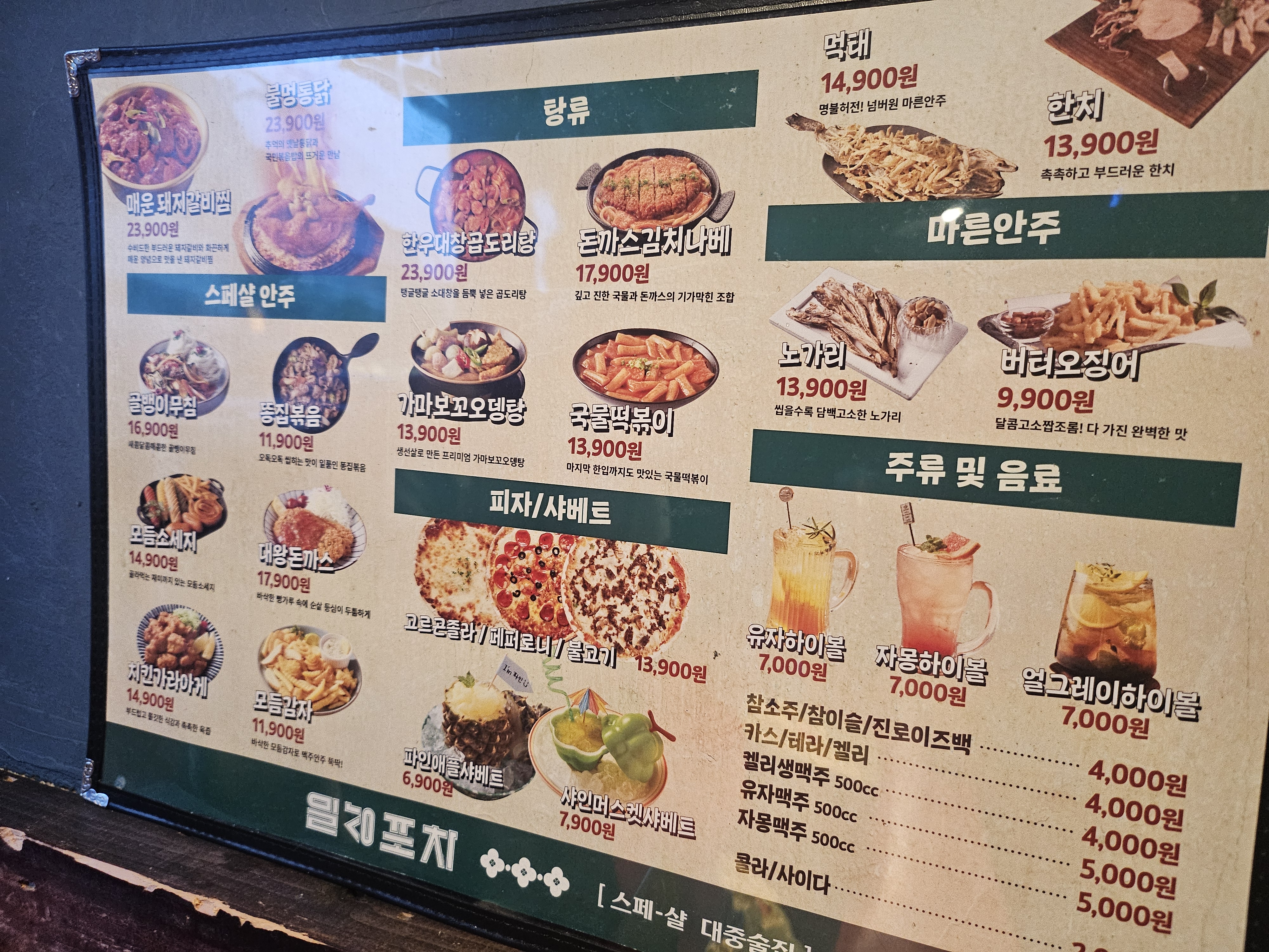 메뉴판은 이렇게 돼 있어요. 1차로 갔으면 피자나 샤베트 등 맛있어 보이는 여러 메뉴들 먹어보았을텐데 2차로 배부르게 가는 바람에 간단한 마른안주로 골라보았습니다.