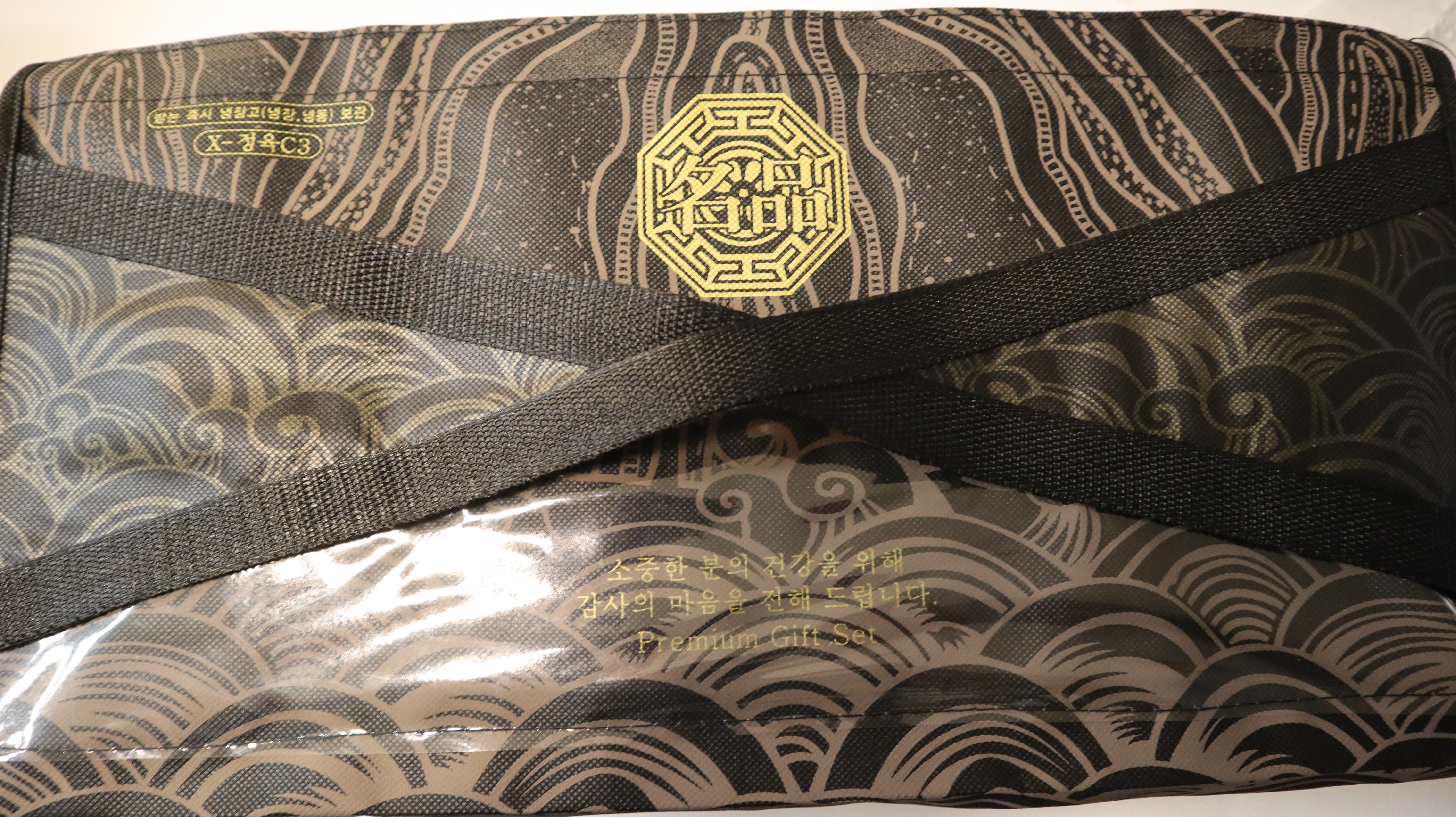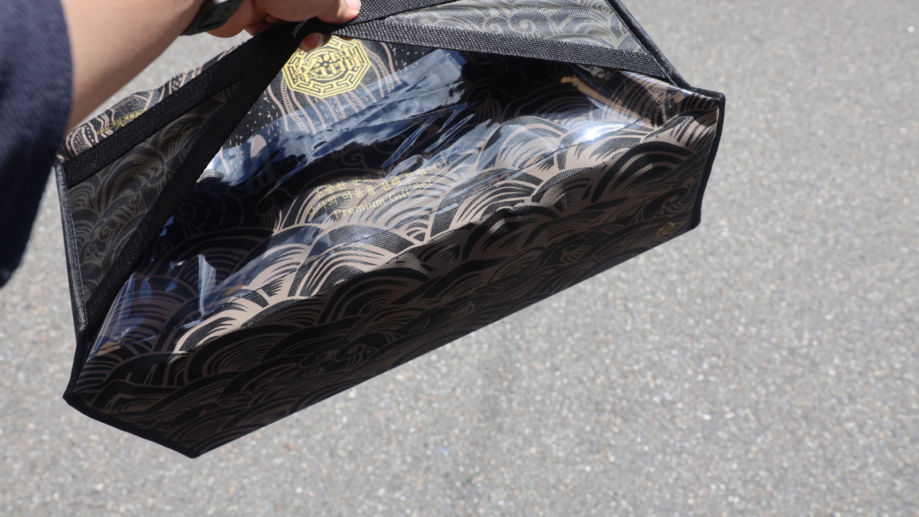 생각보다 꽤 묵직~하네요. 사진에서처럼 선물세트의 경우에는 선물세트 전용 포장이 있는데 찍찍이로 돼 있어서 오픈하기 쉽도록 돼 있고 손잡이도 있어서 들고 다니기 편했습니다.
