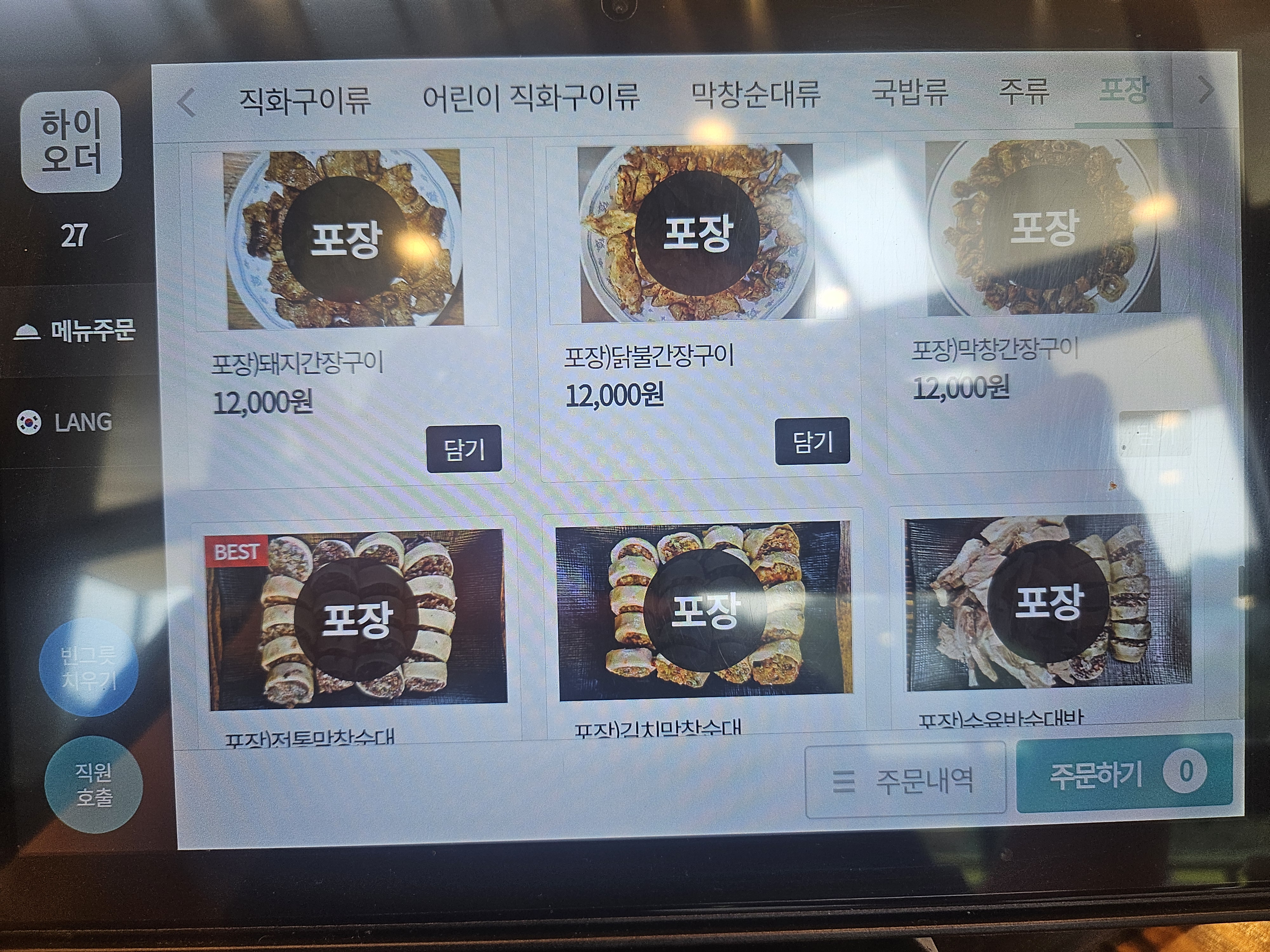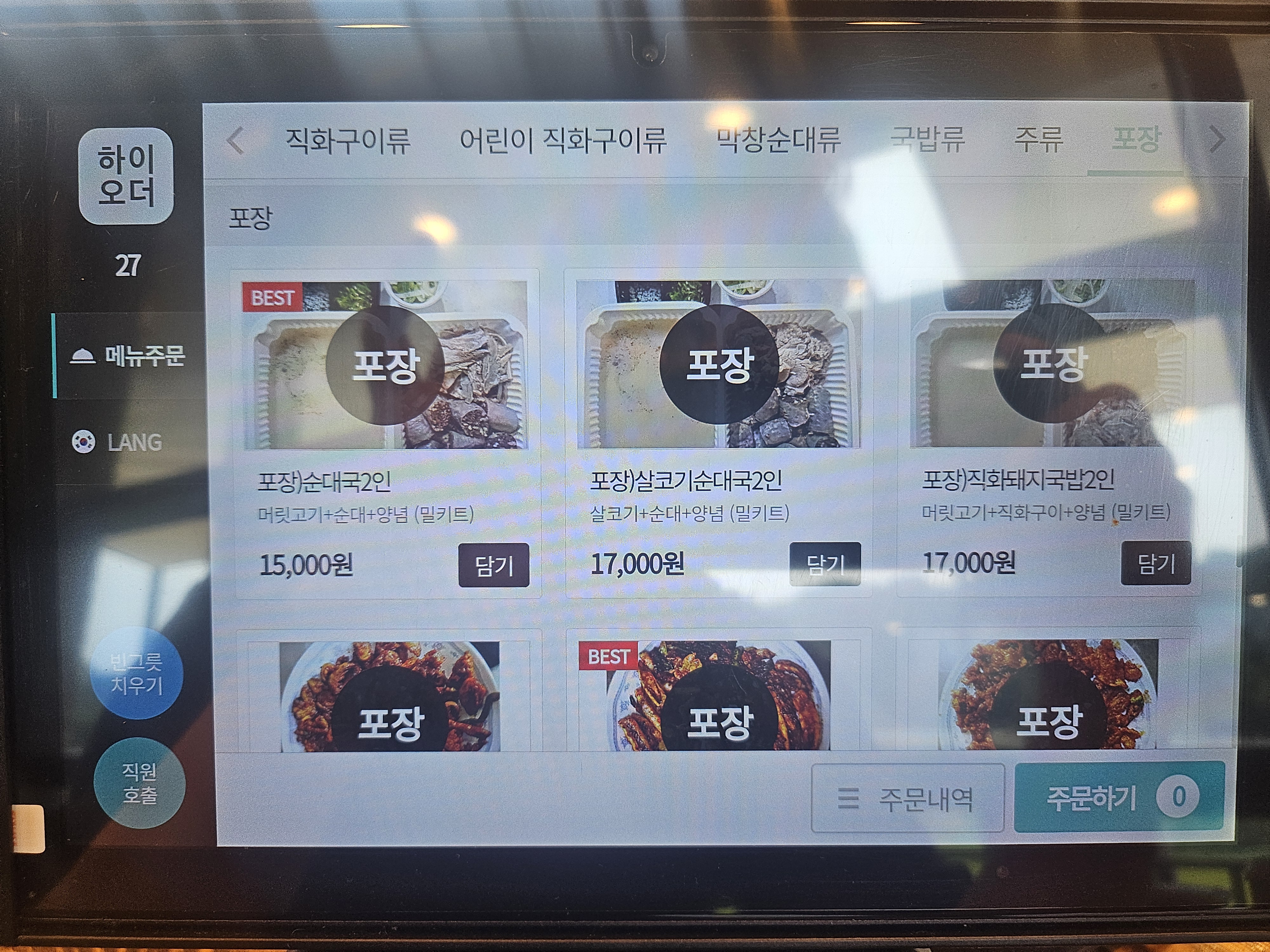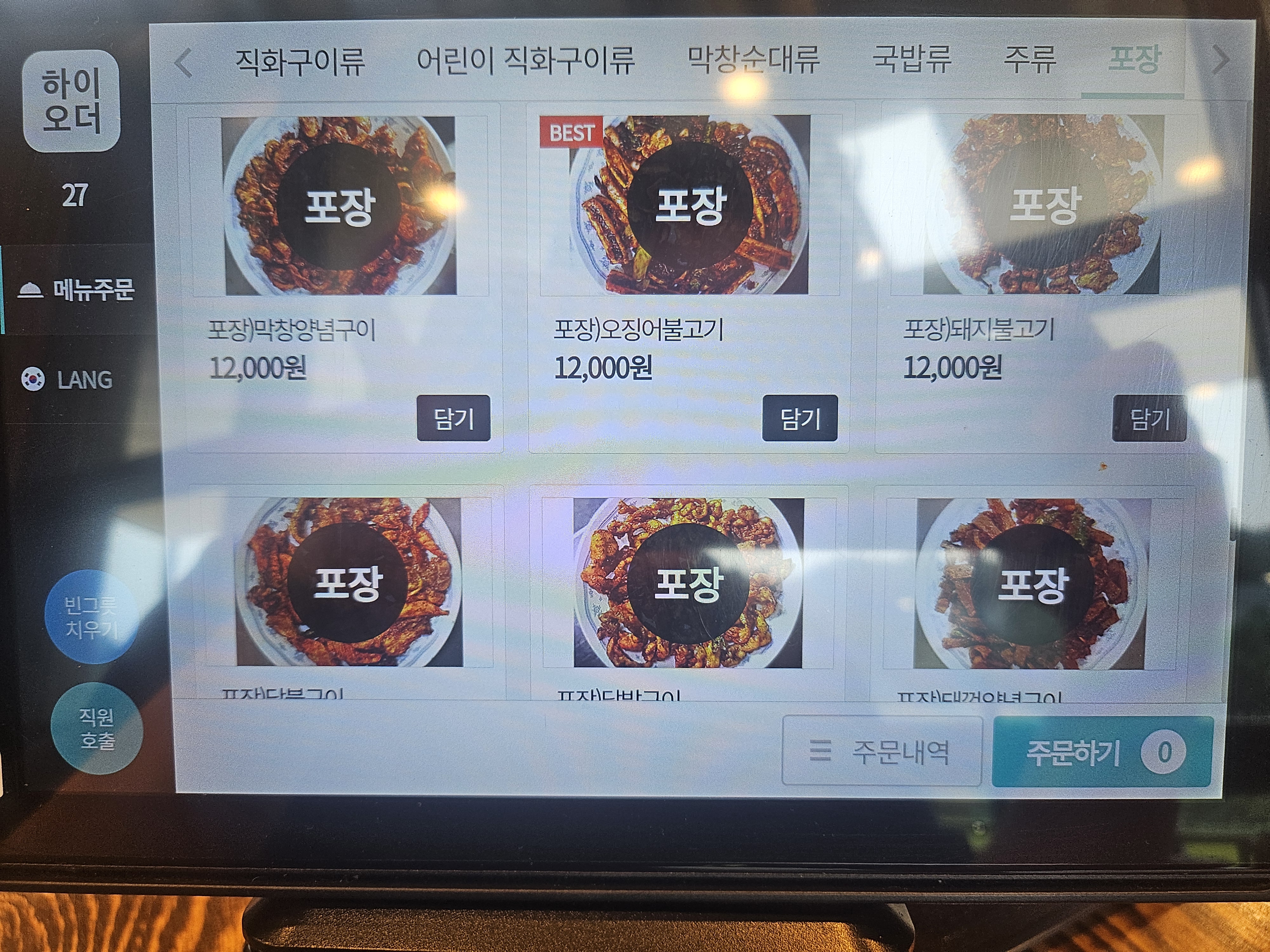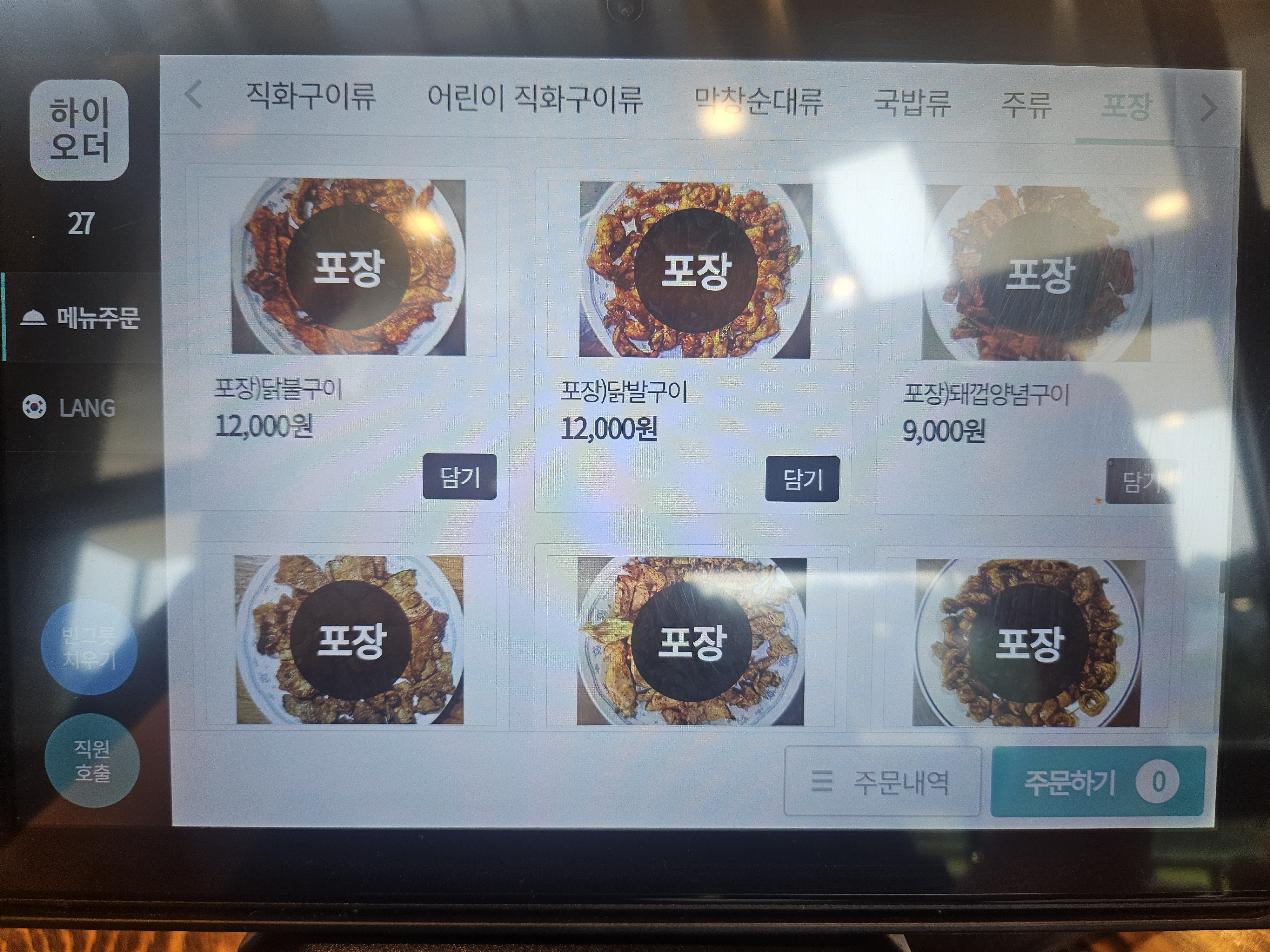 일단 이 식당에서는 테이블 오더가 설치돼 있어서 자리를 잡은 후 테이블 오더 시스템으로 바로 주문하고 결제하면 되는 방식인데요. 여러가지 메뉴들이 나열돼 있는데 이번에는 특히 포장용으로 나온 제품들을 보여드리고 싶어서 촬영해보았습니다.