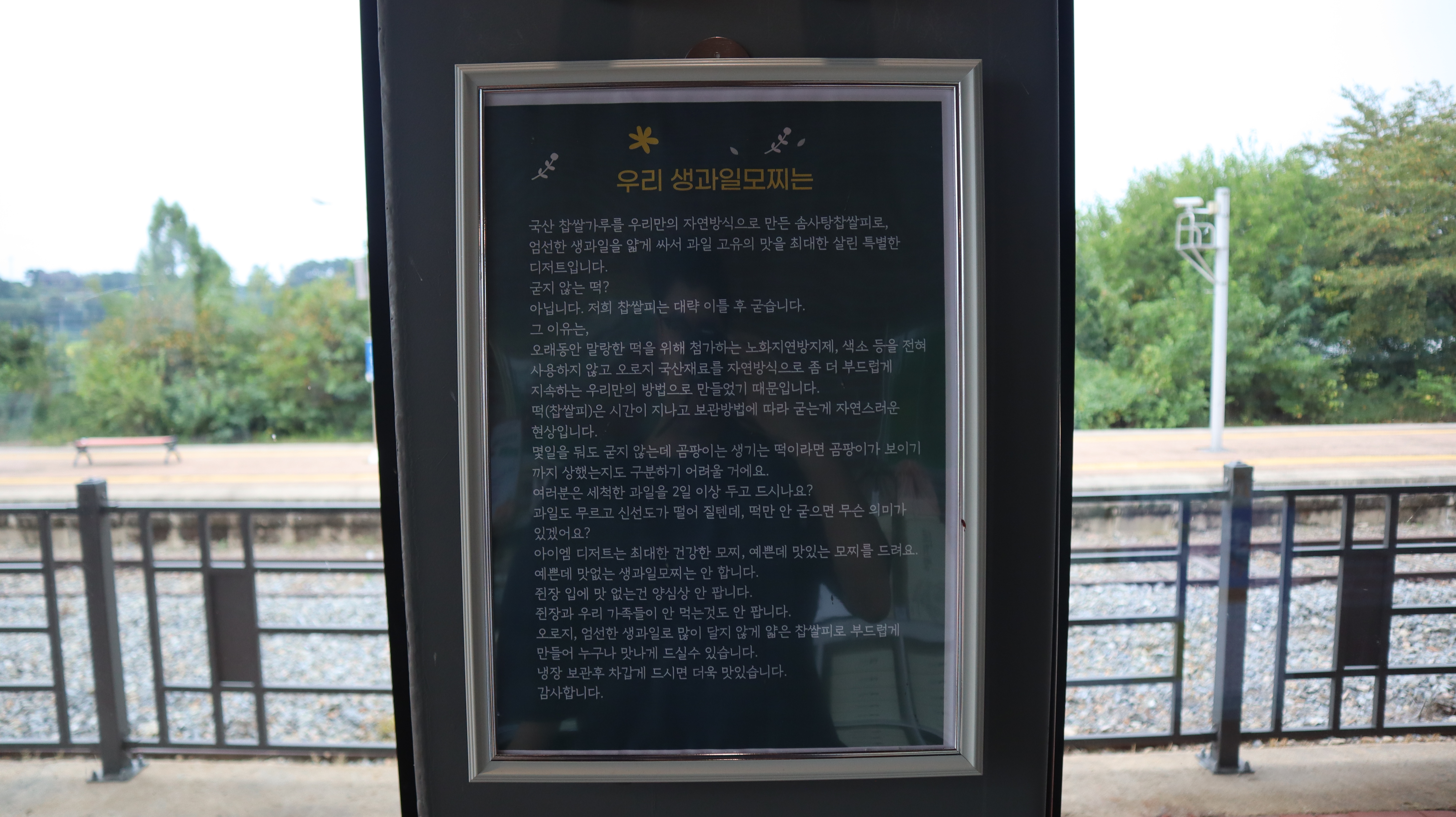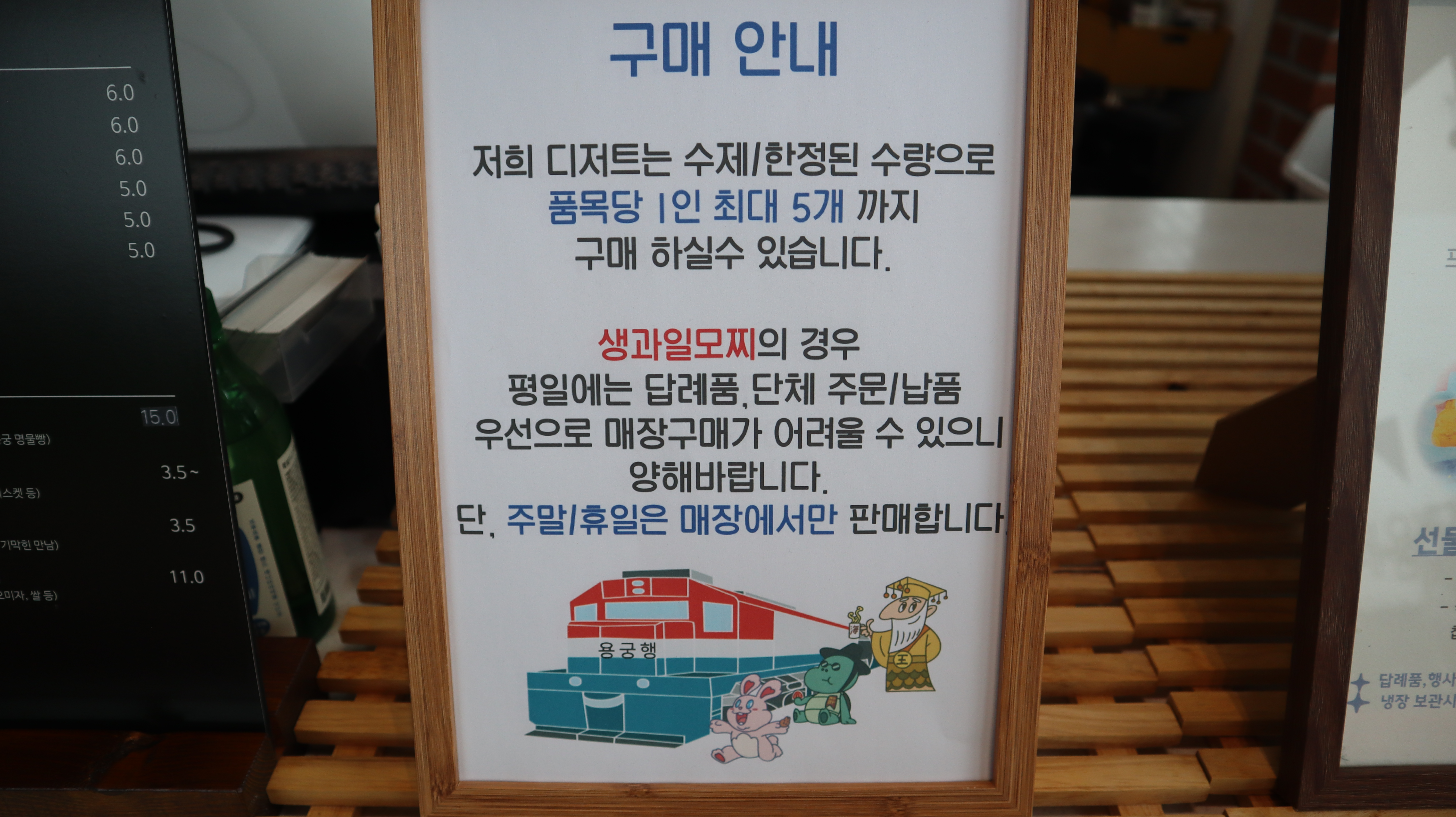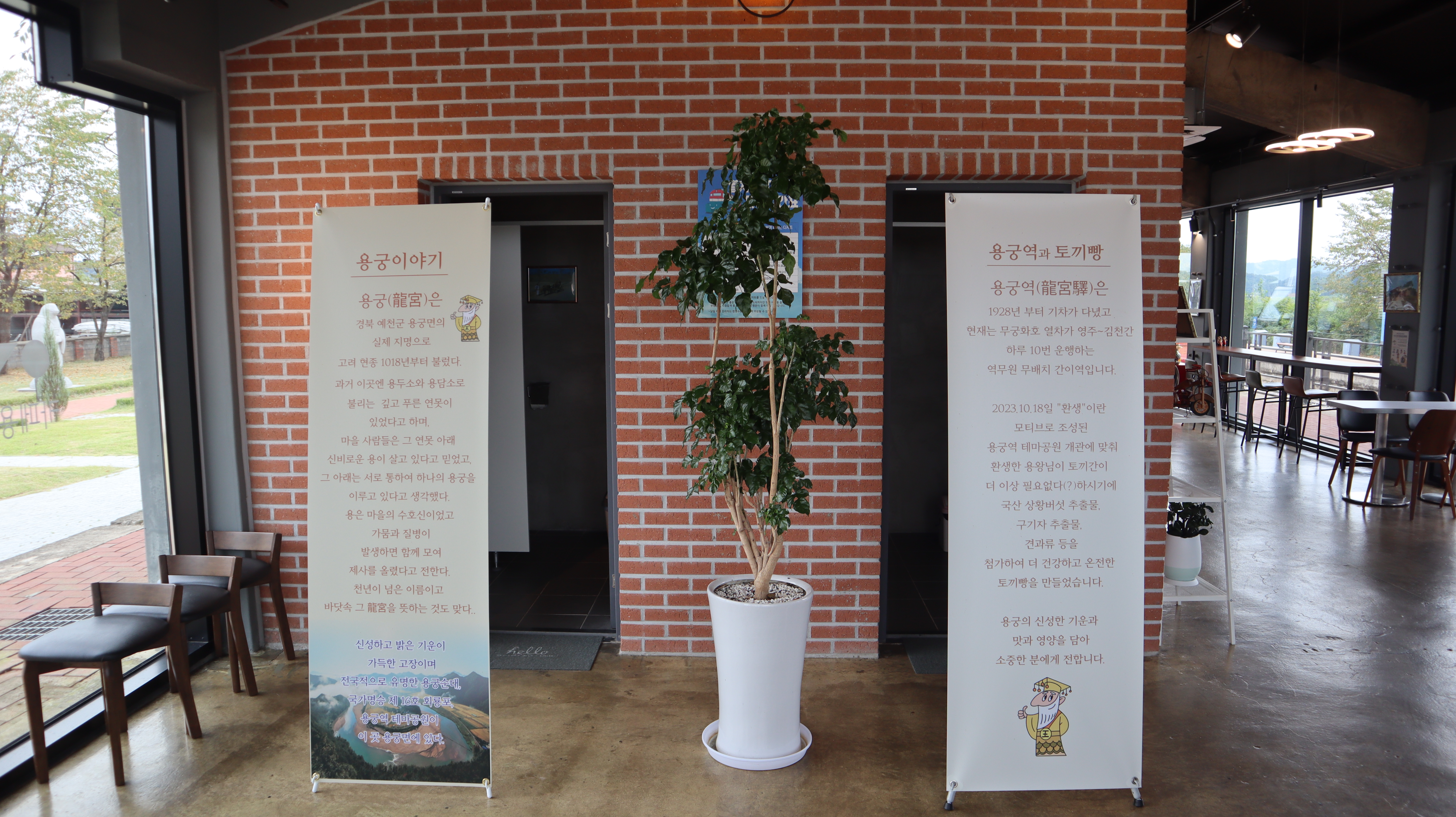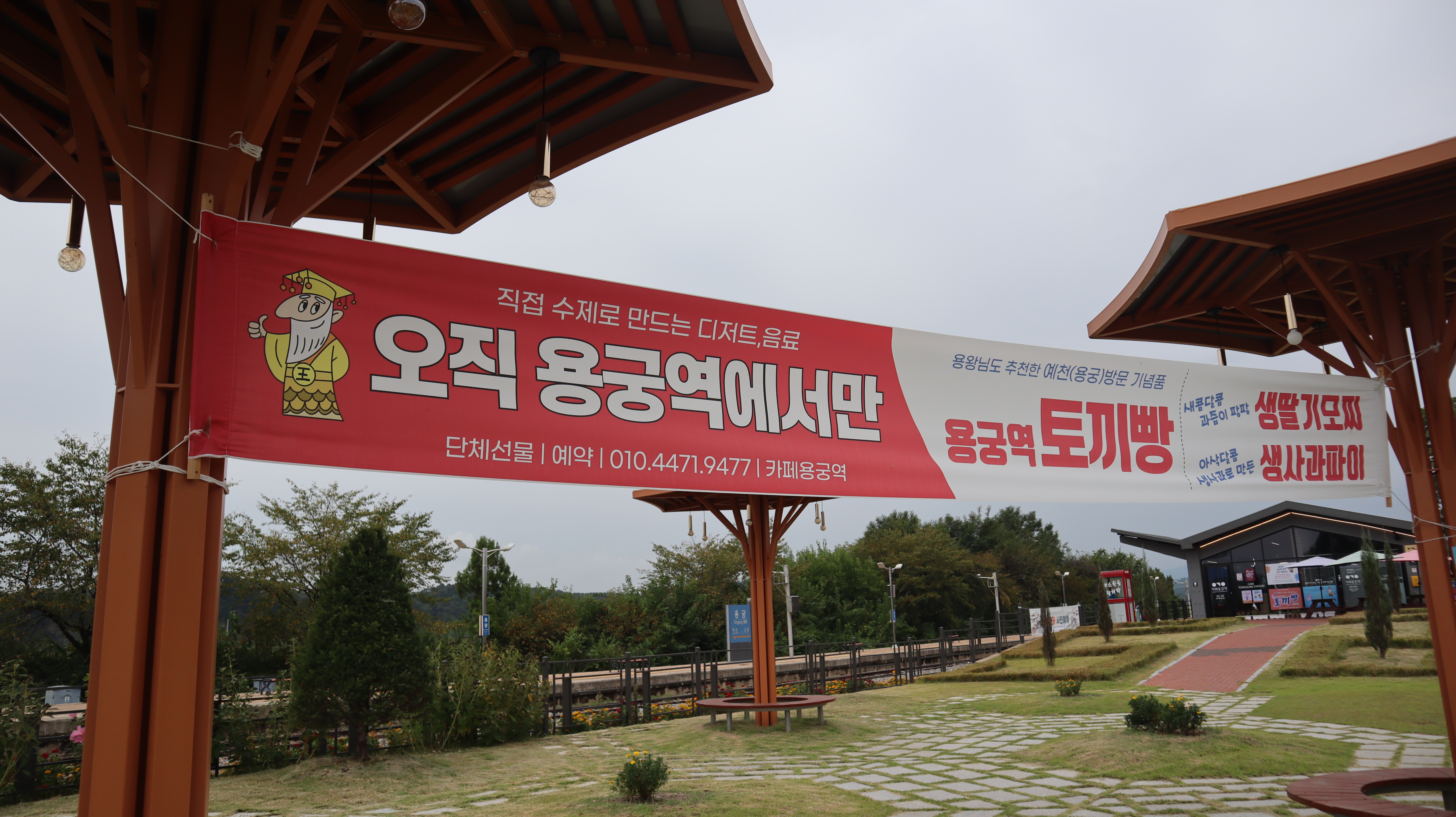 용궁역에 주차를 하고 조금만 이동하면 카페 용궁역에 도착할 수 있습니다. 카페 앞에 조성된 공원에서 카페 용궁역 관련된 현수막도 볼 수 있었는데요. 수제로 만든 디저트와 음료가 있다고하며 용궁역 토끼빵과 모찌, 생사과파이 등이 있다고 합니다.