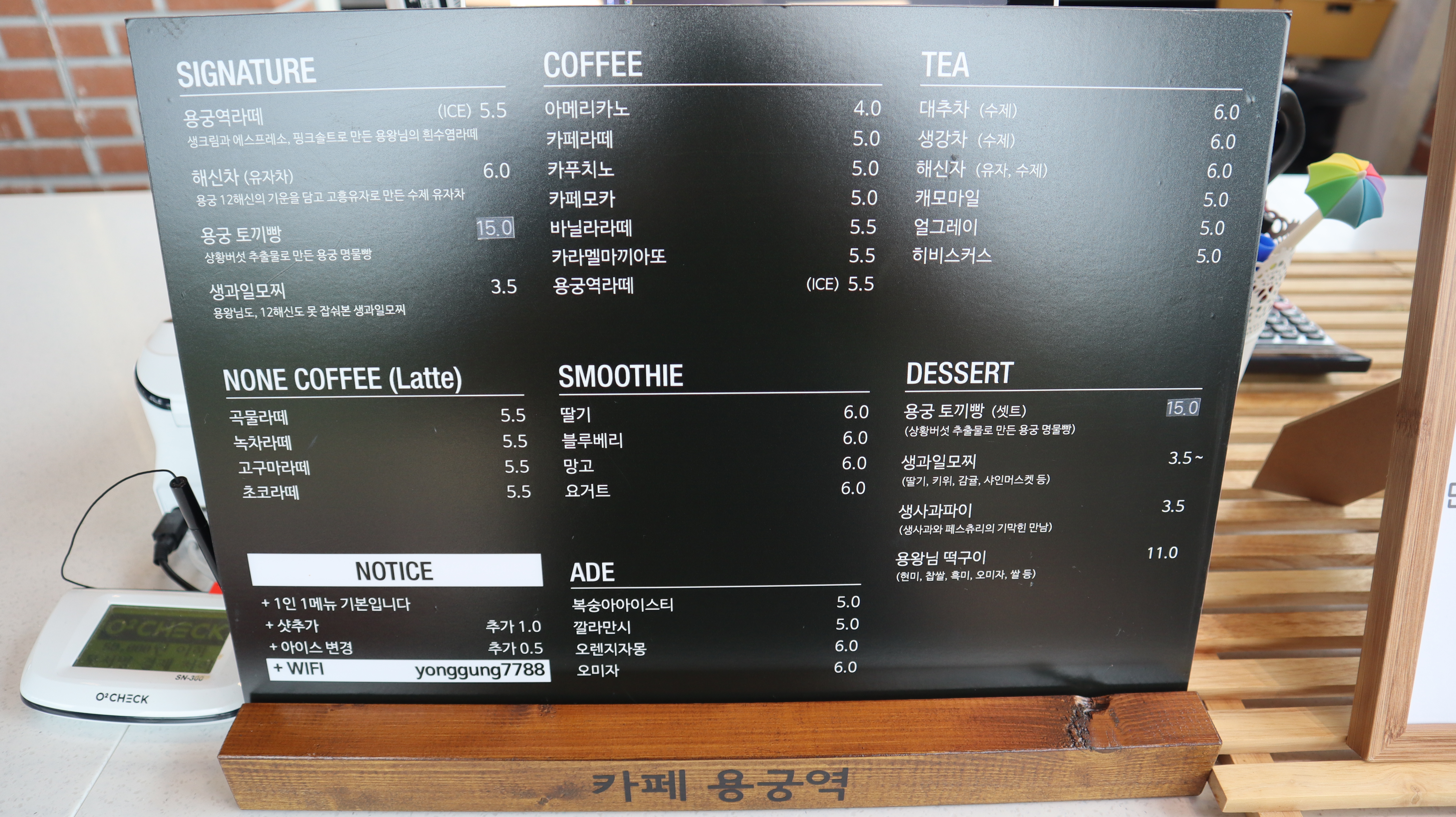 카페에 들어서니 사장님께서 친절하게 맞이해주시네요. 카페 용궁역의 메뉴판입니다. 시그니처 커피류와 스무디, 에이드, 디저트 류 등 다양한 메뉴들이 준비돼 있습니다.