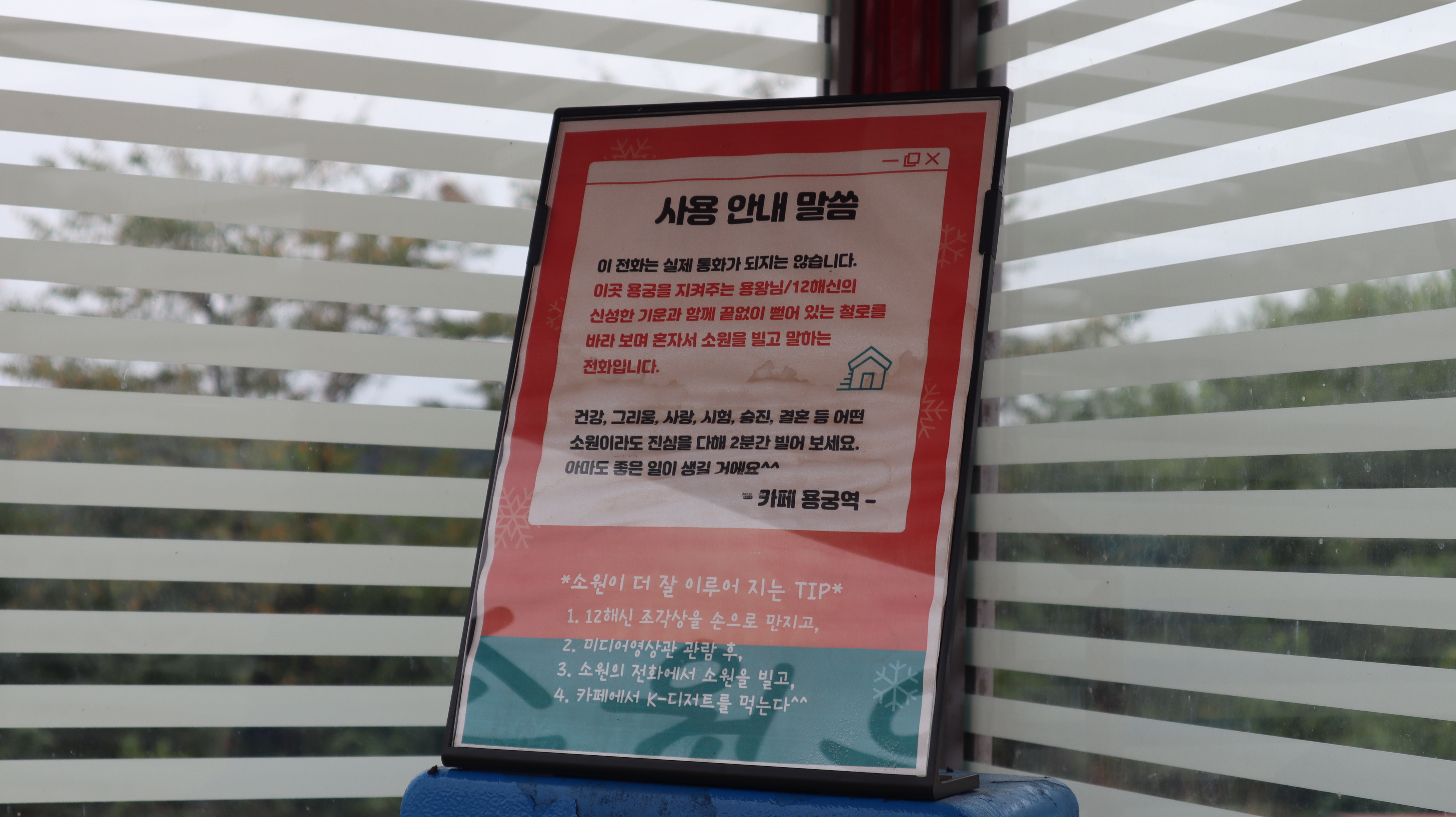 야외에는 소원의전화라고하는 즐길거리도 있는데요. 수화기를 들고 소원을 이야기해보는 즐길거리인데 실제 통화가 되는건 아니라고 합니다. 여기에 있는 공중전화는 제가 어릴 때 길거리에서 많이 봤었던 녀석이에요. 동전을 위에서 넣는... 그런 스타일의 옛날식 공중전화인데 간만에 보니까 반가웠습니다.
