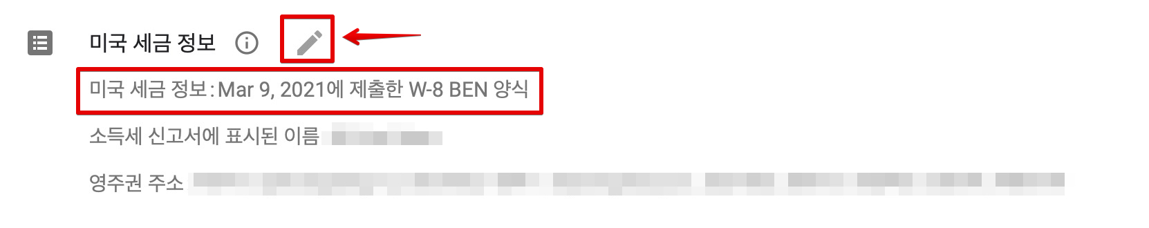 [설정 관리]에 보면 [미국 세금 정보]란이 있습니다. 여기 옆에 있는 연필 모양의 수정 버튼을 클릭해줍니다. 아래쪽에 이전에 제출했던 양식과 날짜를 확인할 수 있습니다. 저같은 경우 2021년에 한 번 제출했던적이 있었다고 나오네요.
