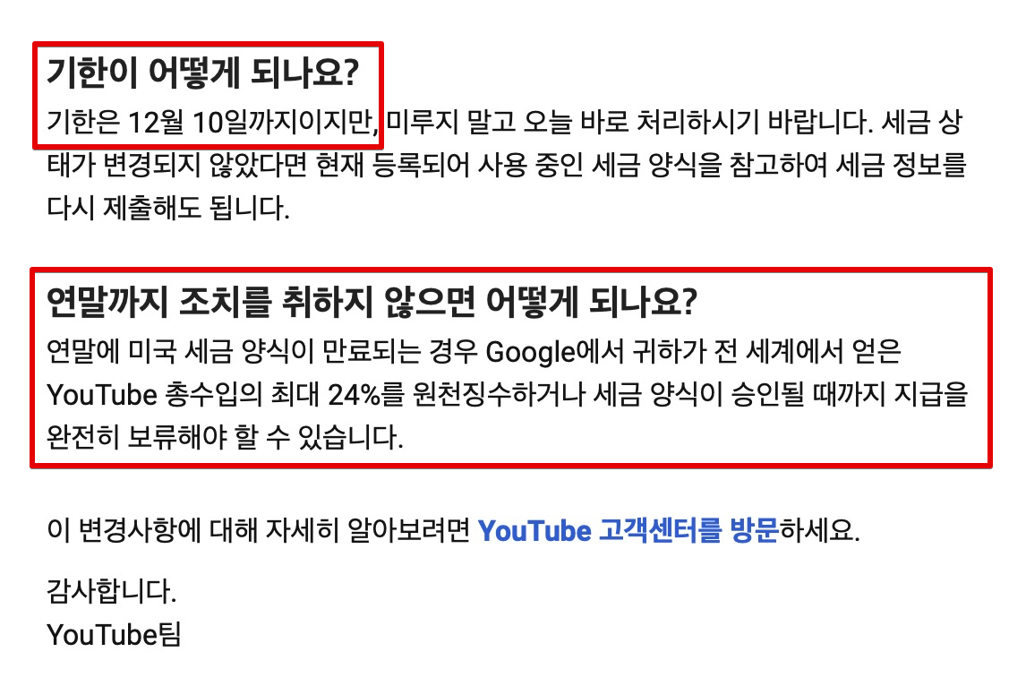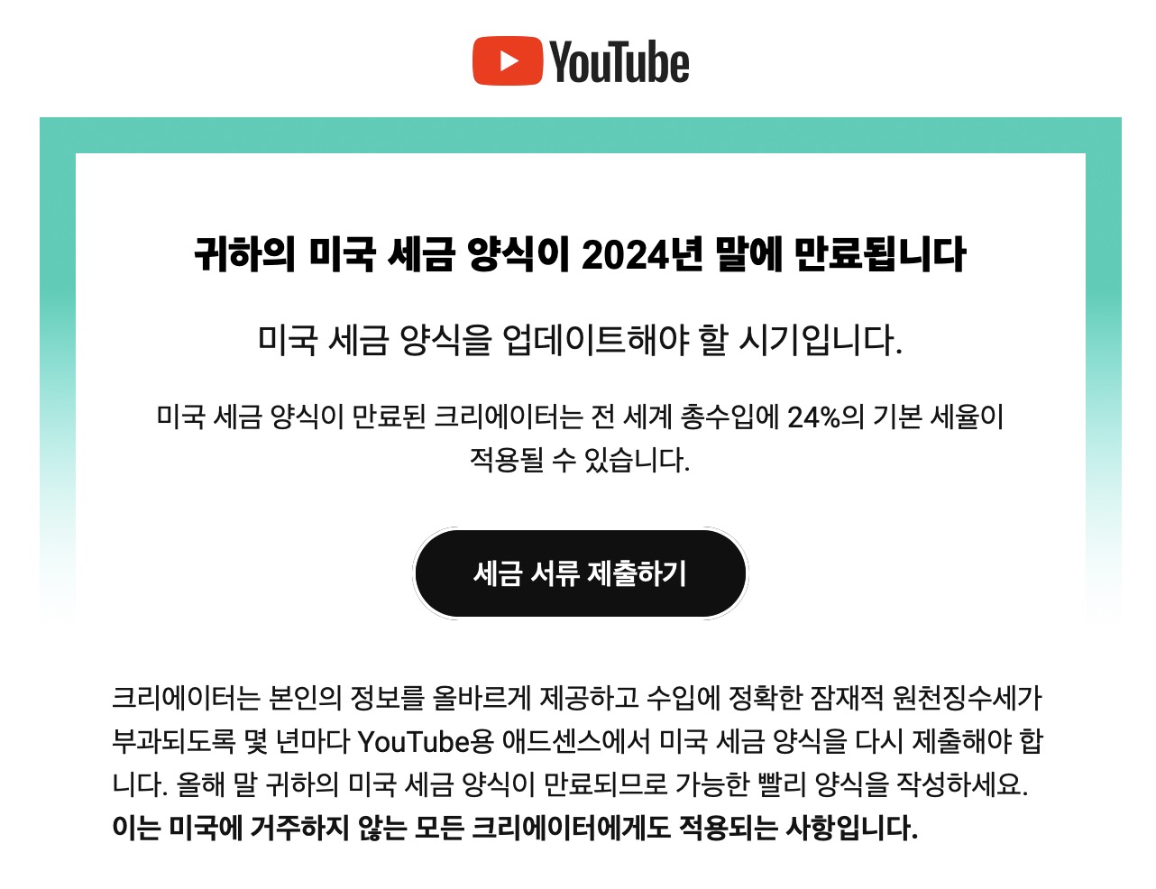 구글 유튜브에서 위와 같은 이미지를 담은 이메일이 오더라고요. 유튜브 채널이 여러개라서 각 채널별로 다 들어오는것 같습니다. 하지만 애드센스 계정은 개인당 1개이므로 1개의 계정에서만 미국 세금 양식을 업데이트하면 됩니다. 위 내용은 티스토리 블로그나 유튜브에서 수익을 창출하는분들이라면 꼭 해야하는 미국 세금 양식 제출입니다.