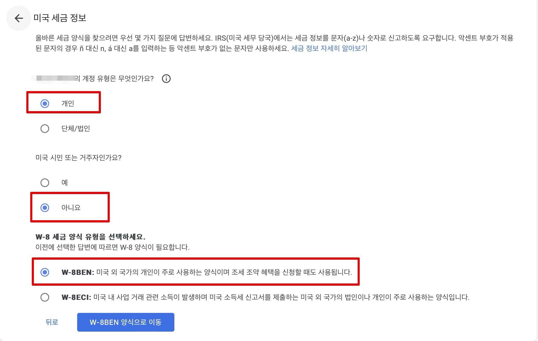 으로 선택해주세요. 계정 유형에서 사업자일 경우 단체/법인으로 선택하면 됩니다. 사업자일 경우 미국과의 조약 관계에 따라 세금 원천징수 일부 감면 혜택이 있습니다.